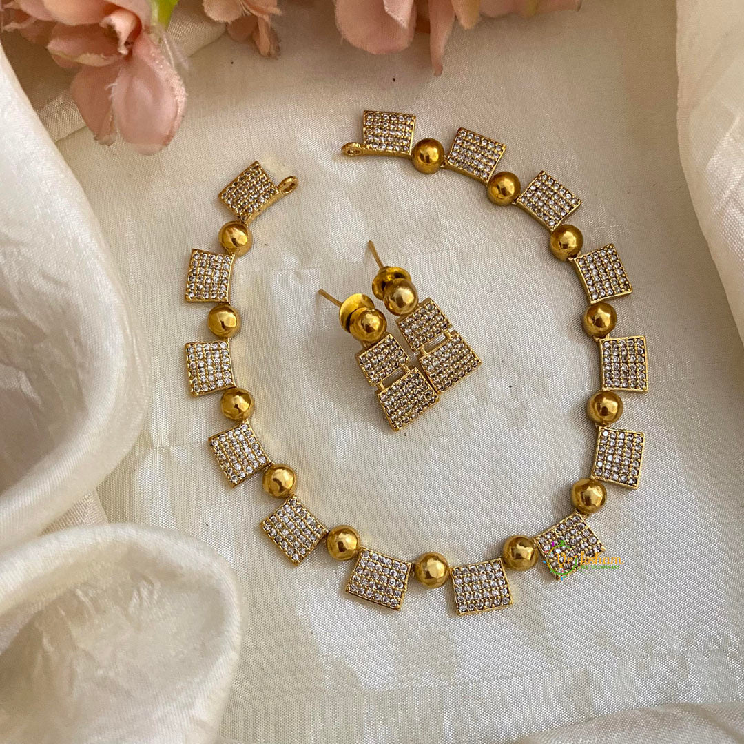 Unique AD Stone Short Choker Neckpiece- Premium gold look alike AD stone patterned short pendant neckpiece with earrings.