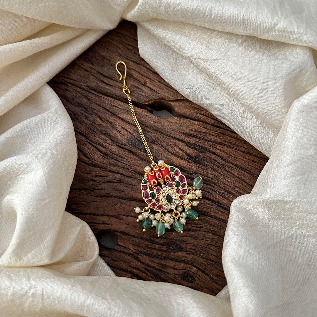 Introducing our luxurious Unique Coral Maang Tikka that is adorned with stunning green beads and lustrous pearls. Elevate your traditional look with this exclusive piece which is sure to make a statement and add a touch of elegance to any outfit. Perfect for special occasions and weddings.