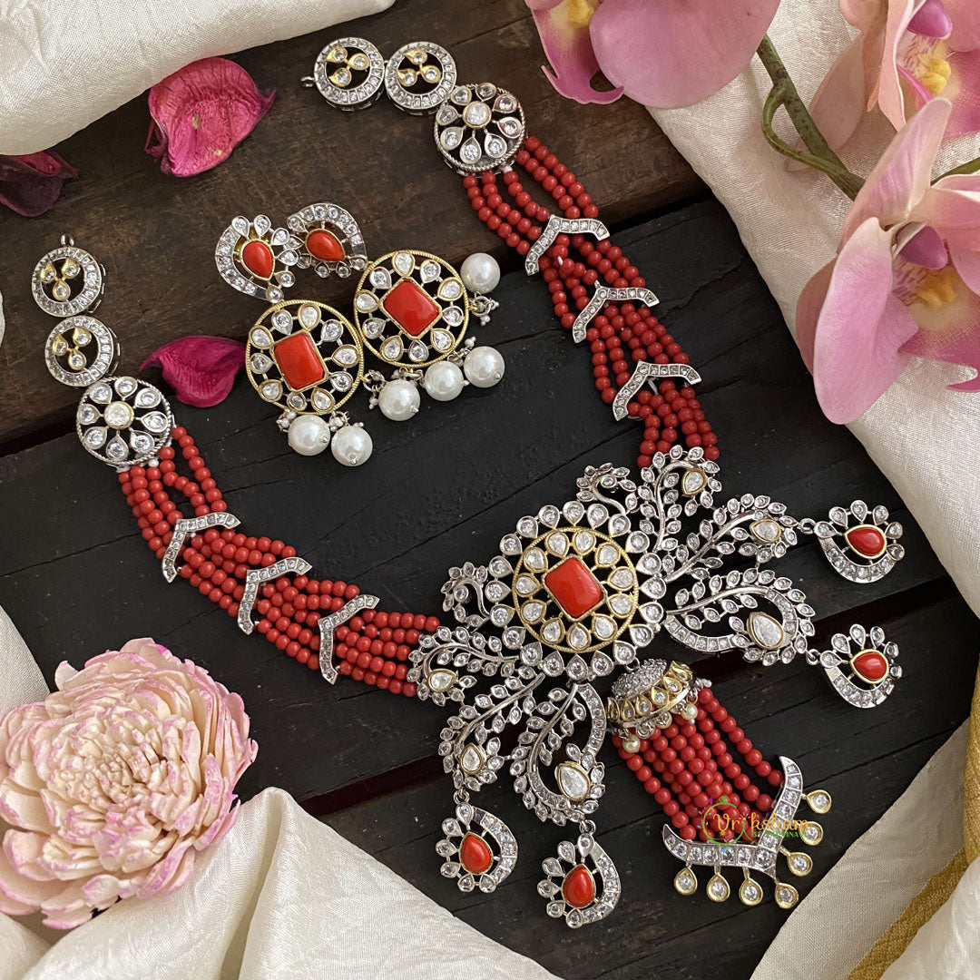 Unique Designer Multilayer Victorian Diamond Short Neckpiece- Red Beads-VV1582
