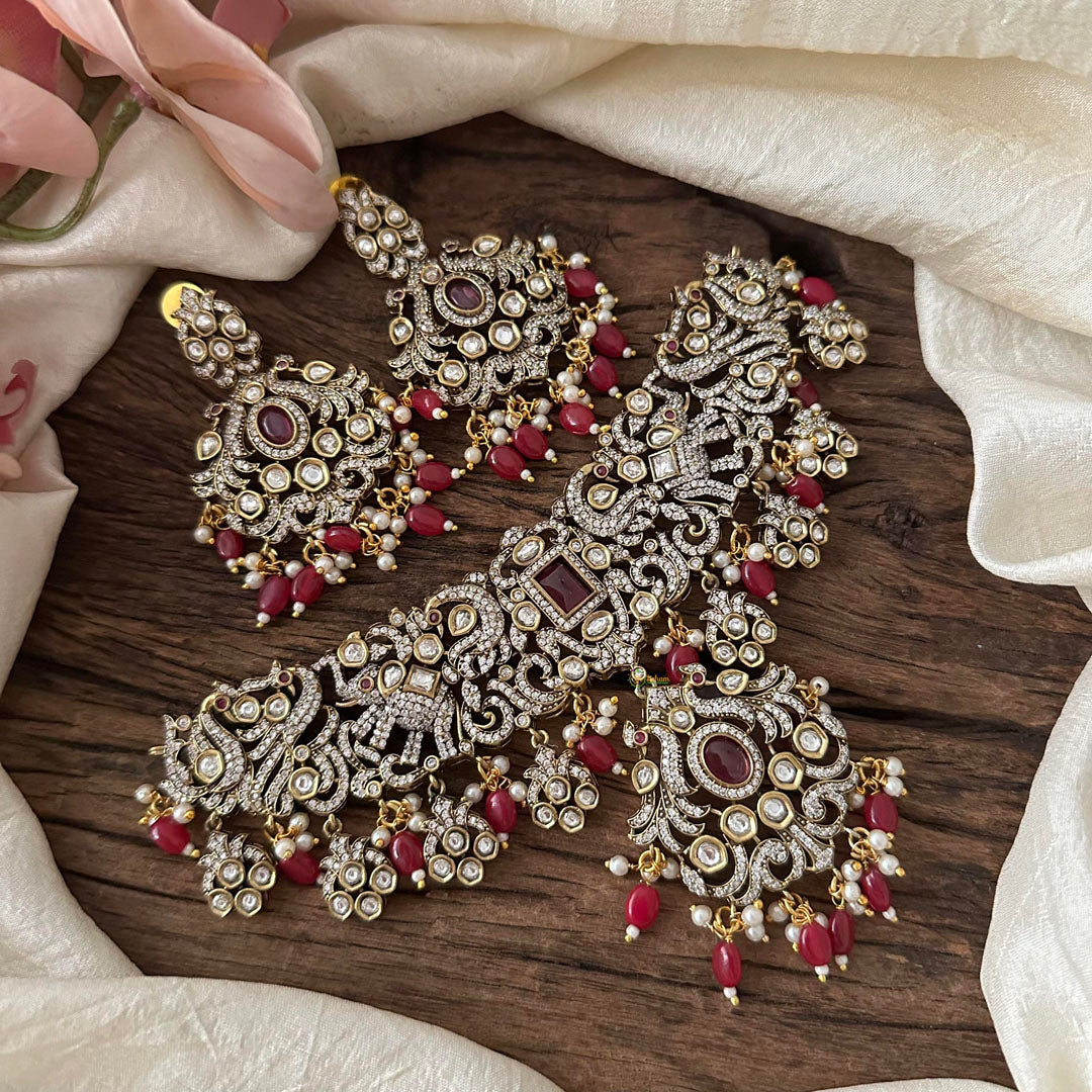 Indulge in a touch of opulence with our Unique Elephant Peacock Victorian Diamond Choker. Embellished with a red bead, this necklace is a must-have for those who appreciate the finer things in life. Elevate your style and channel your inner royalty with this exquisite piece. Comes with matching earrings.