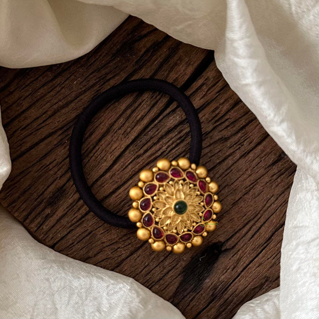 Add a unique touch to your festive look with our Unique Gold Alike Festive Rubber Band. Adorned with green and red stones, this floral band exudes elegance and charm. The finishing touch of golden beads adds a luxurious feel to the band. Elevate your style with this one-of-a-kind accessory.