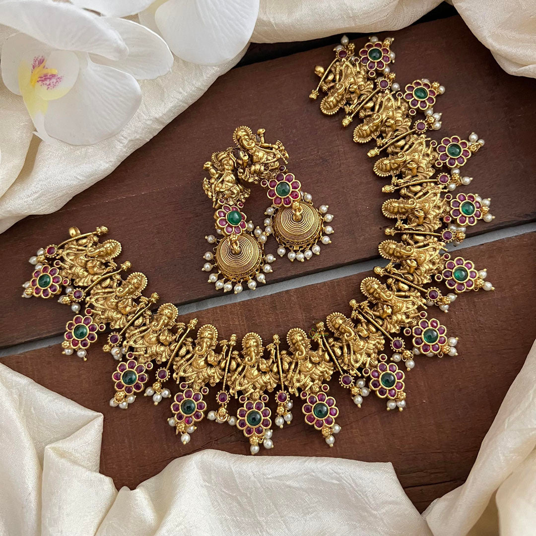 Indulge in luxury with our Unique Gold Look Alike Ganesha Neckpiece. Adorned with stunning pearls and a touch of vibrant red and green stones, it exudes elegance and sophistication. Embrace your inner divinity and add a touch of opulence to any outfit. Elevate your style with this one-of-a-kind accessory.