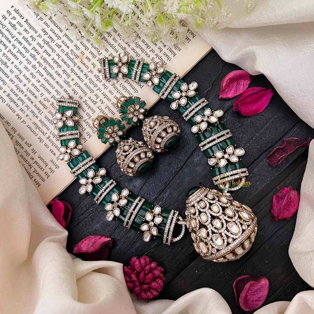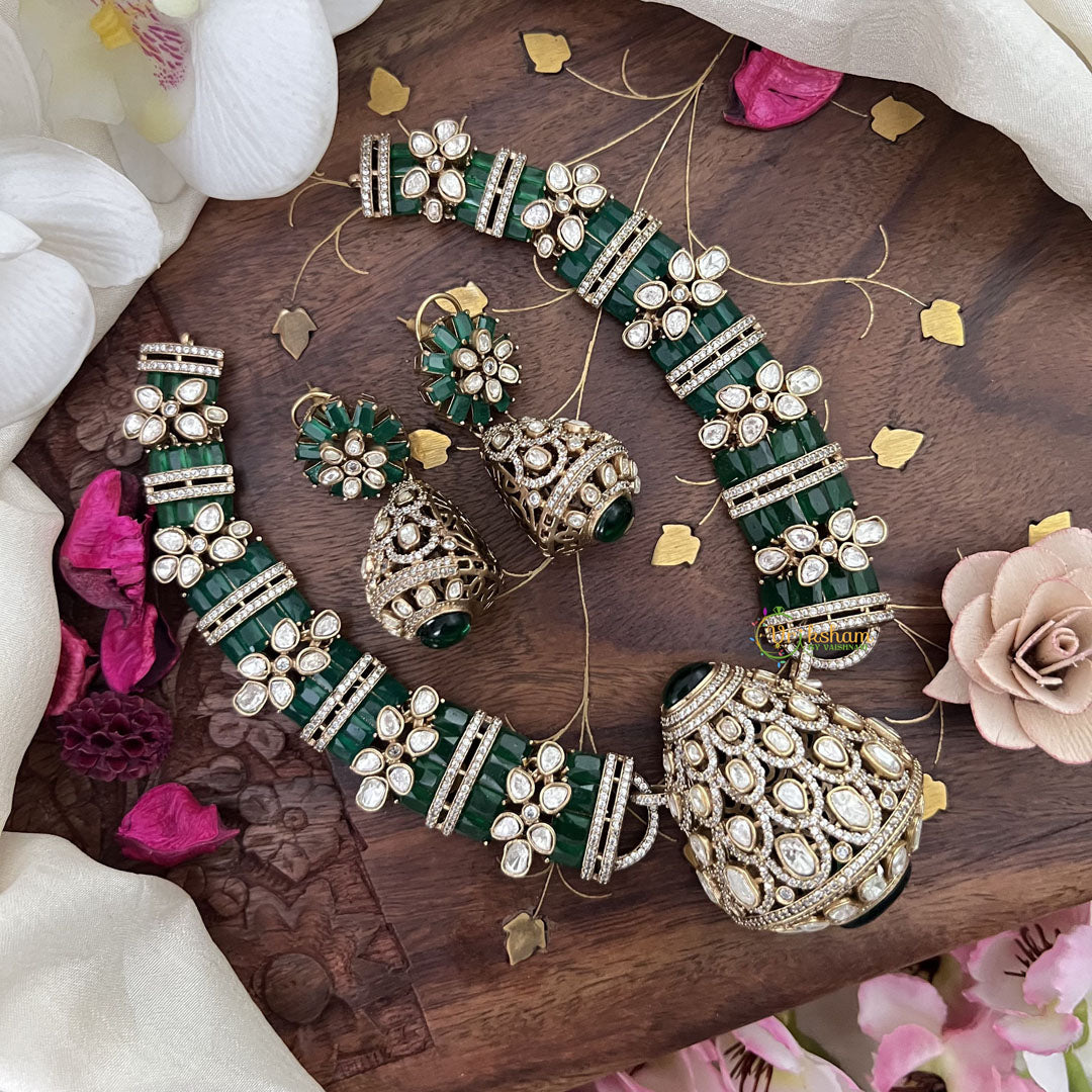 Introducing our Unique Green Victorian Diamond Hasli, a must-have for any fashion-forward individual. The beautiful green diamonds add a pop of color to this traditional Victorian style necklace, making it a unique statement piece. Exude confidence and elegance with this stunning Hasli, perfect for any occasion. Comes with matching earrings,