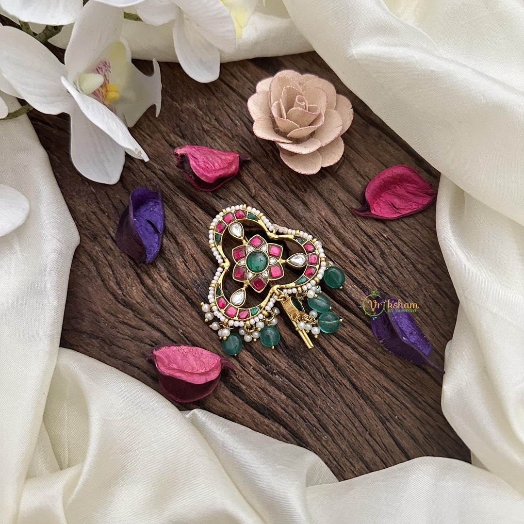Indulge in the exquisite elegance of our Unique Jadau Juda Pin. Handcrafted with a unique design, this pin features intricate jadau work and green beads, elevating any hairstyle with a touch of luxury. Stand out and make a statement with this one-of-a-kind piece.