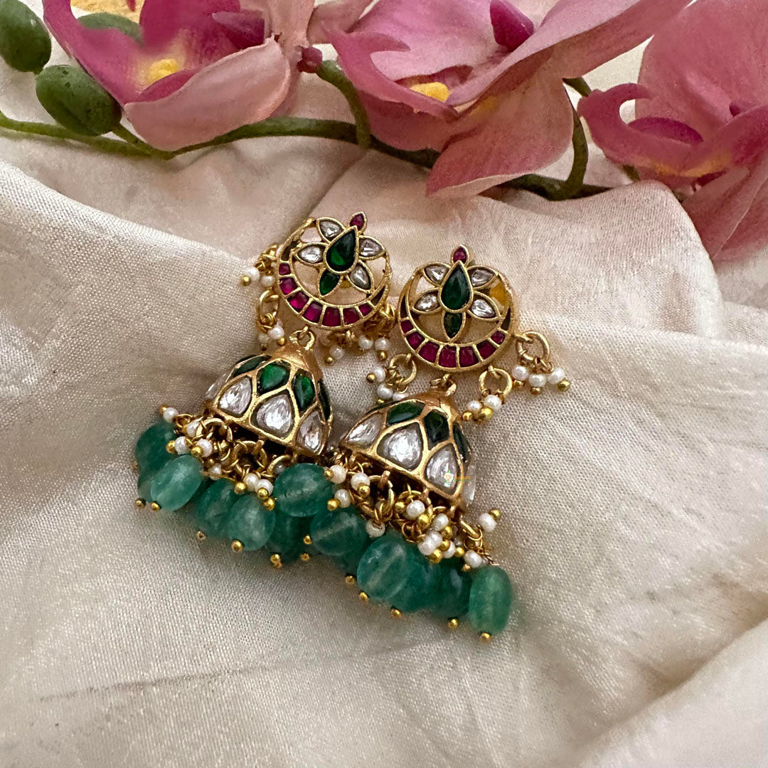Unique Jadau Kundan Jhumkas-Aqua Blue Beads-Pearls-J2185
