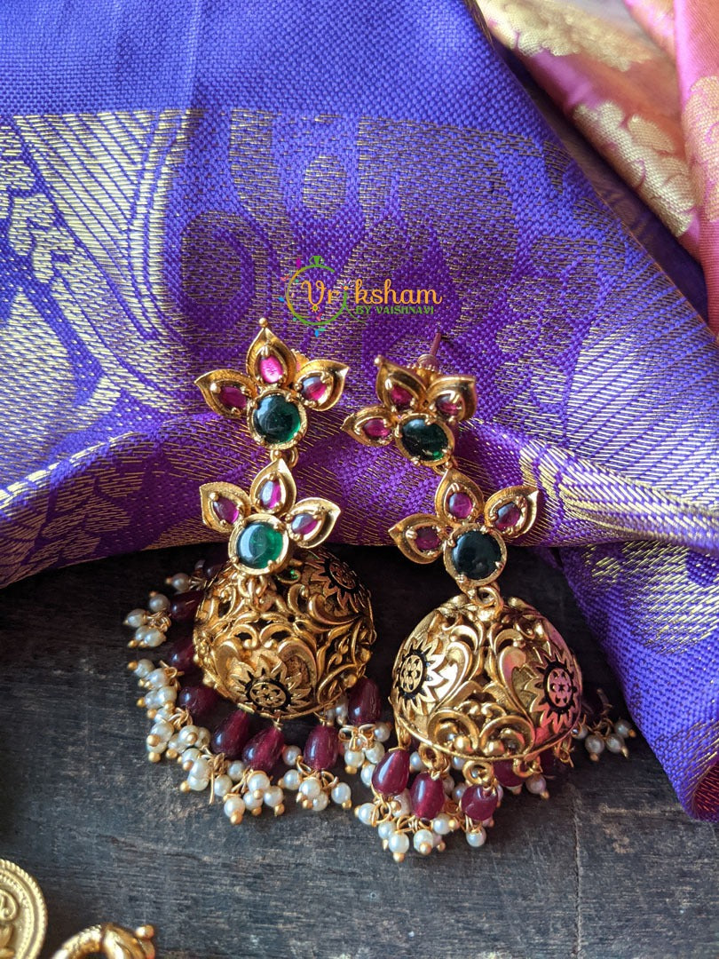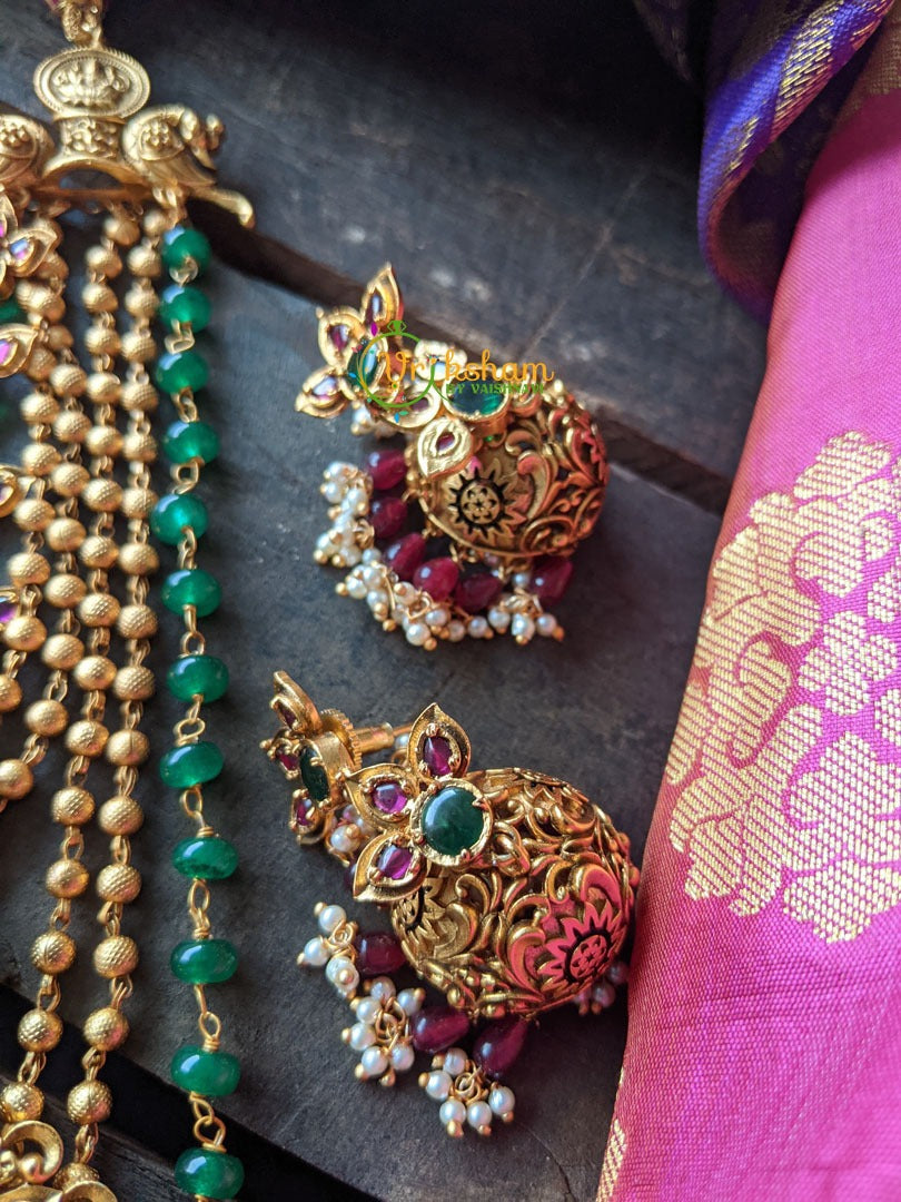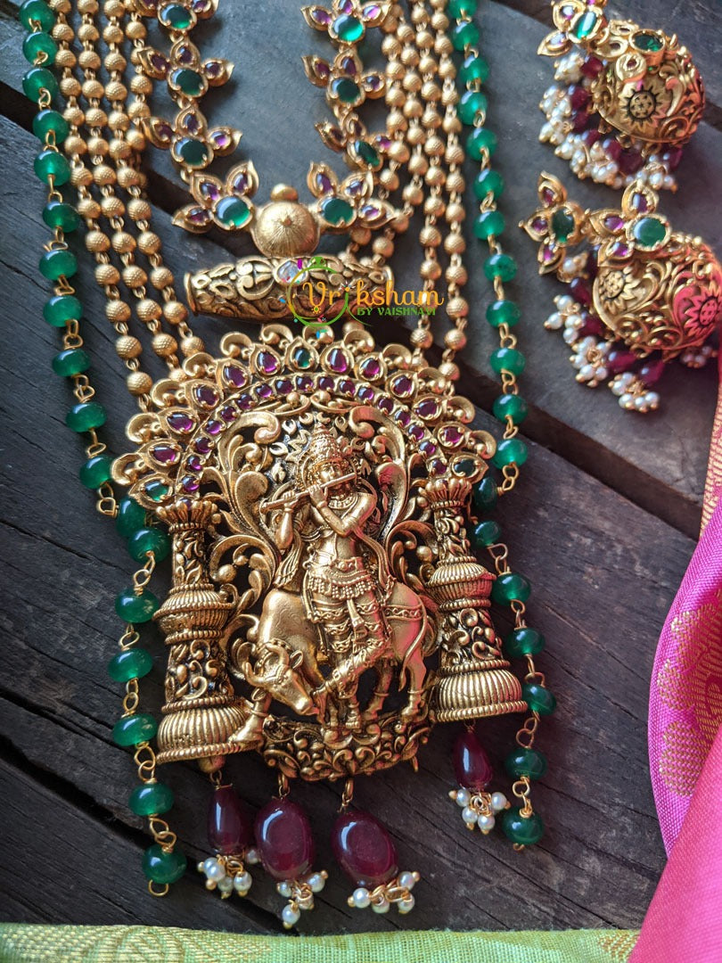 Unique Krishna Pendant Mid length Neckpiece -Outer green bead layer; 4 golden bead layers; green kemp inner layer and Krishna pendant neckpiece. Comes with matching jhumkas. Premium Matt finish.
