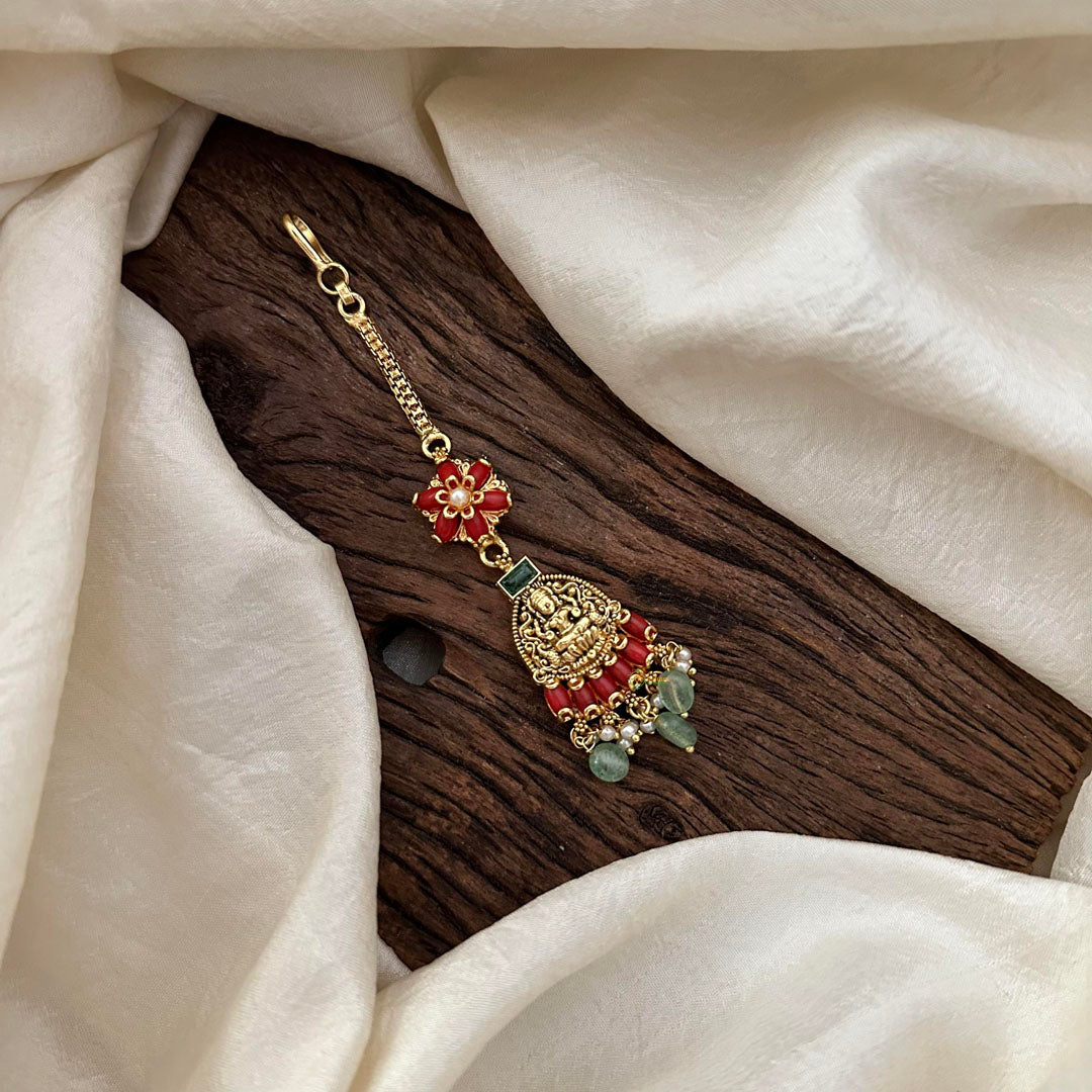 This exquisite maang tikka features a unique Lakshmi design adorned with aqua green bead, and pearl. Elevate your traditional look with the vibrant and elegant touch of this luxurious piece. Perfect for weddings, festivals, and special occasions.