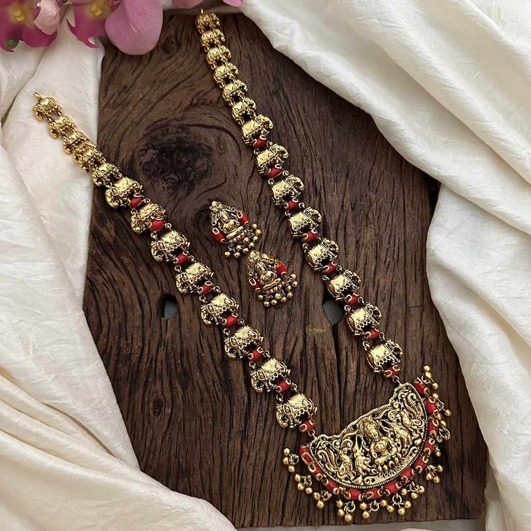 Enhance your look with our exquisite Long Elephant Necklace featuring a Unique Lakshmi Pendant and shimmering Golden Beads. Complete the set with the included matching earrings. Elevate your style with this luxurious and exclusive piece.