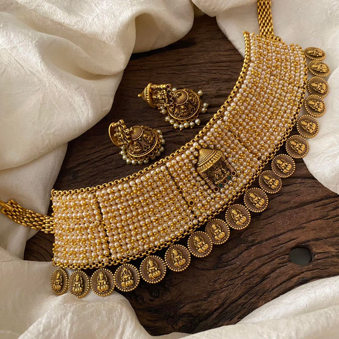Elevate your style with our Unique Lakshmi Temple High Neck Choker. Adorned with a cluster of pearls and finished with intricate Lakshmi coins, this choker exudes elegance. Perfect for special occasions, it adds a touch of luxury to any outfit.