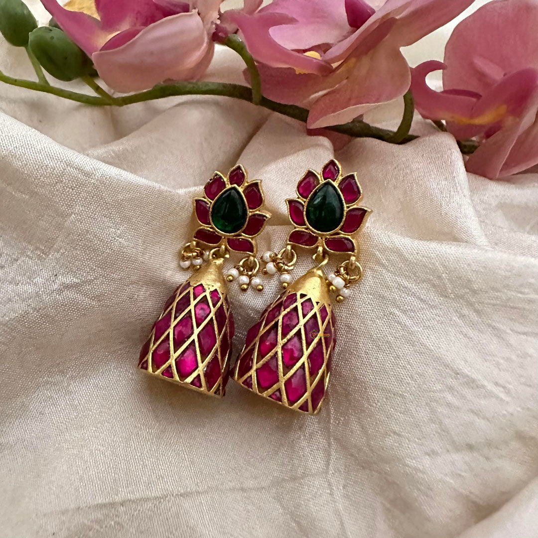 Indulge in the exquisite beauty of our Unique Lotus Jadau Kundan Damru Jhumkas. Adorned with stunning pearls, these earrings are a symbol of grace and elegance. Handcrafted with intricate damru design and delicate kundan work, they are a statement piece that will elevate any outfit. Own a piece of timeless beauty today! The back screw design ensures a secure and comfortable fit.