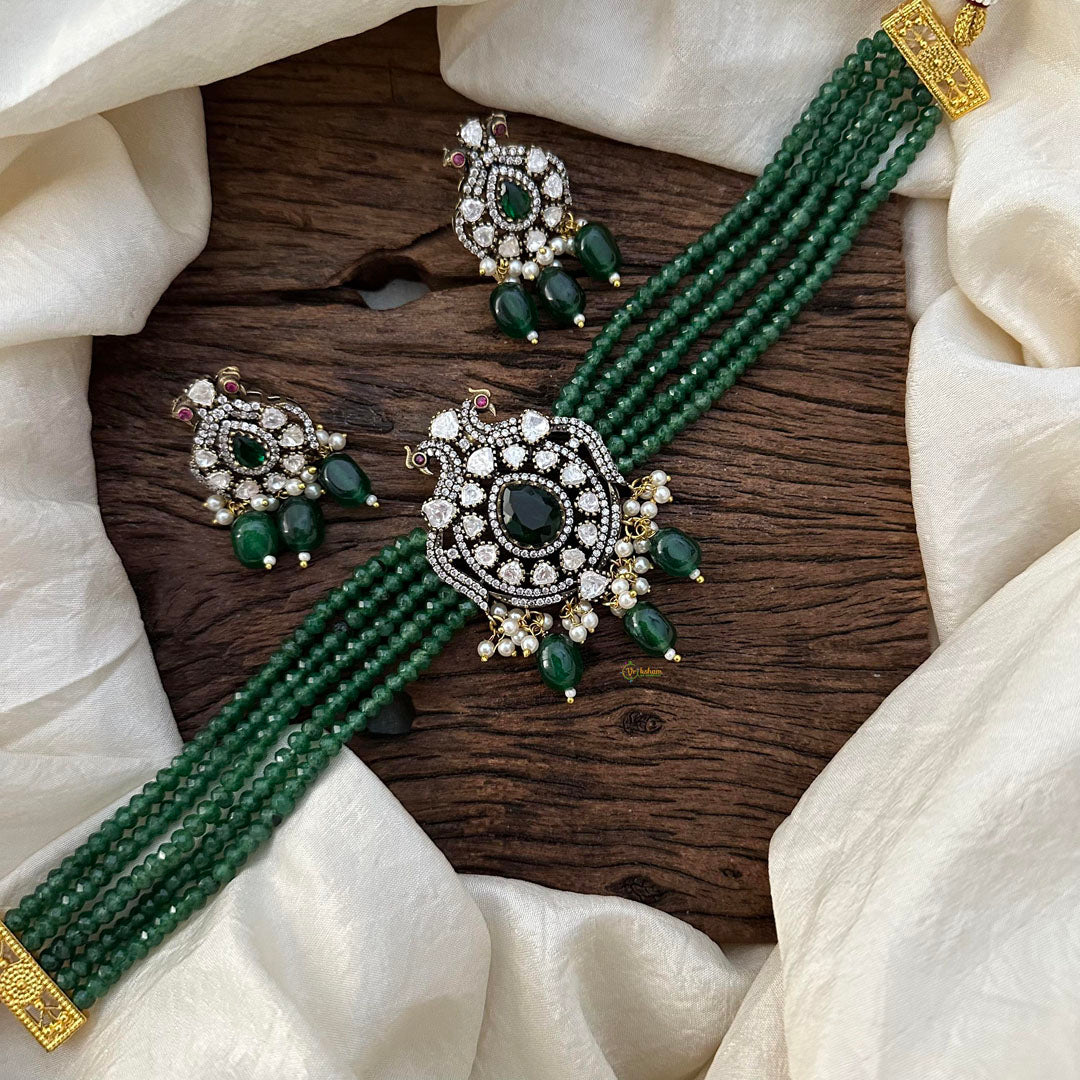 Add a touch of elegance and uniqueness to your look with our Multilayer Victorian Diamond Choker. Featuring dual peacock design, green beads, and a stunning drop-shaped red stone surrounded by sparkling white stones and for finishing tiny pearls and beads are also used. Effortlessly elevate any outfit with this statement piece. Comes with matching earrings.