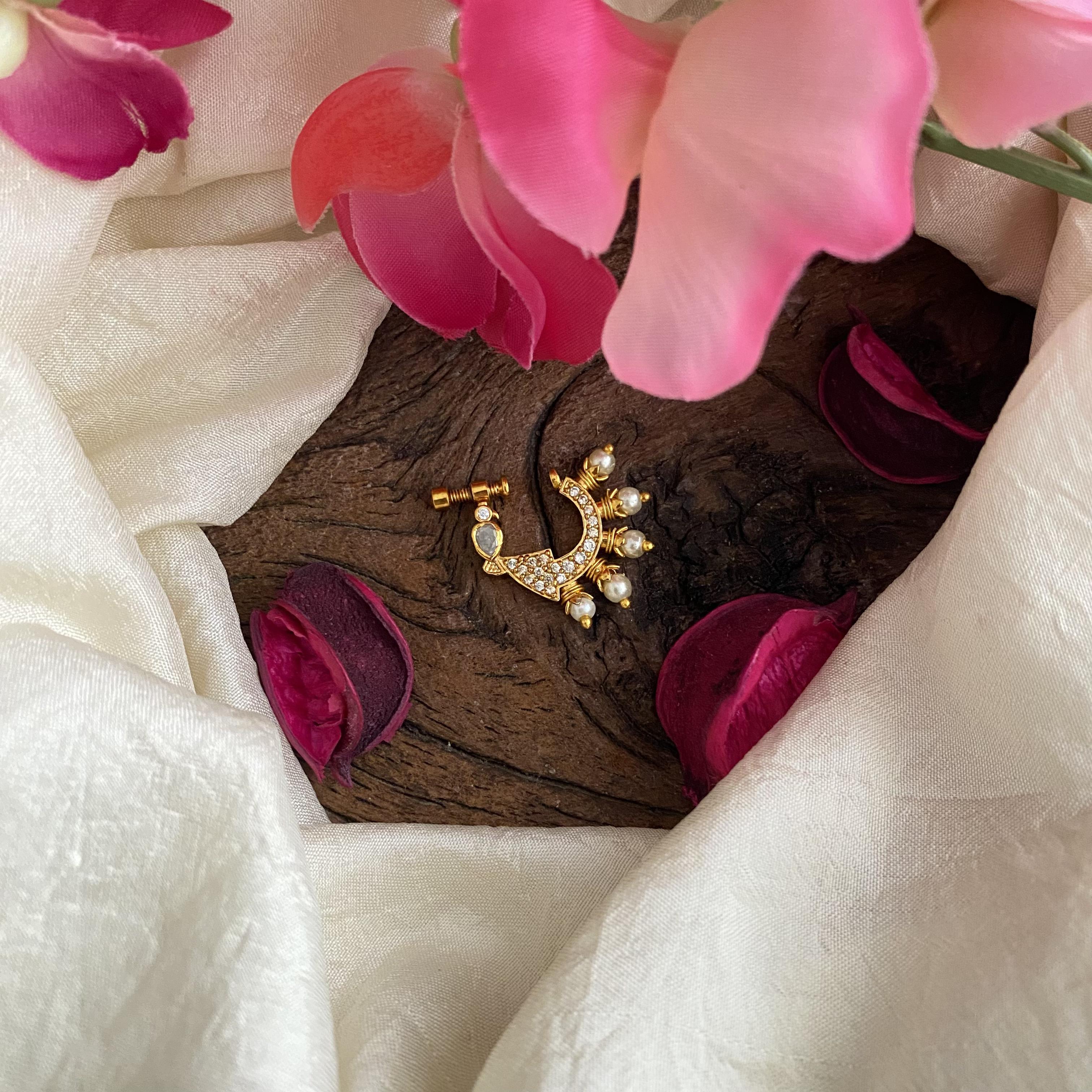 Elevate your style with our Unique AD Stone Nath/Nose Pin. Crafted with dazzling ad stones, this piece adds a touch of sophistication to any outfit. Make a statement and shine in luxury.