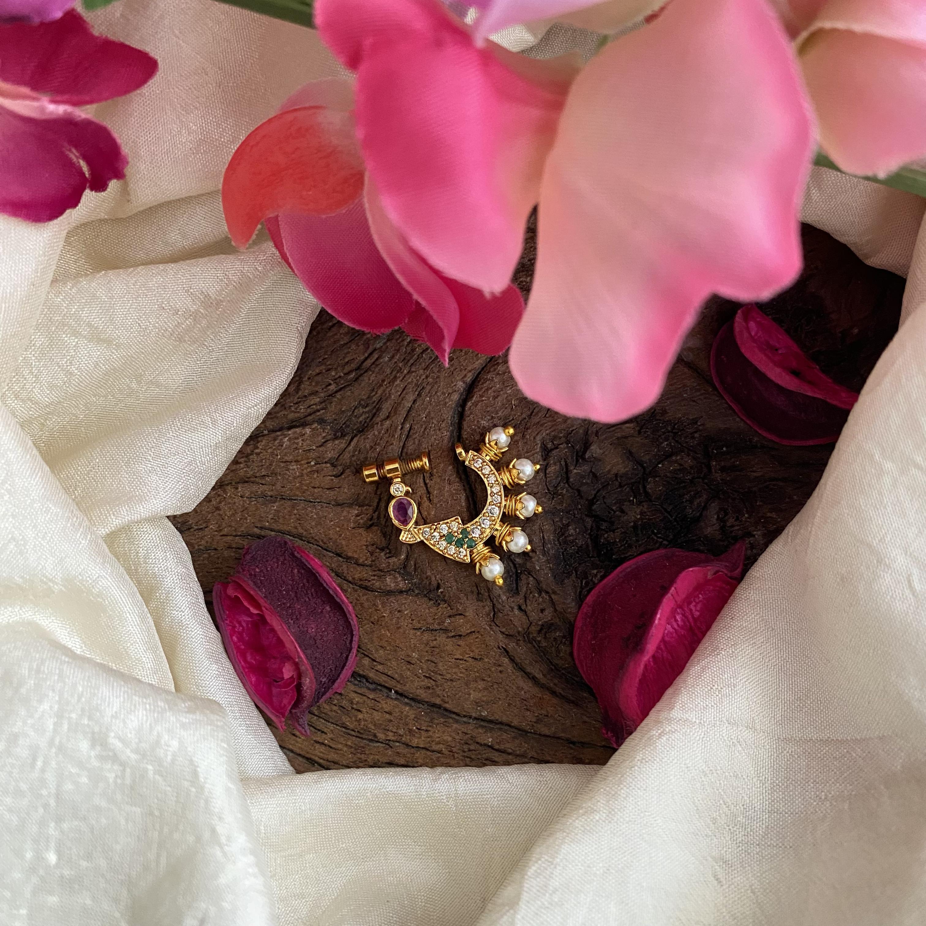 Elevate your style with our Unique AD Stone Nath/Nose Pin. Crafted with dazzling ad stones, this piece adds a touch of sophistication to any outfit. Make a statement and shine in luxury.
