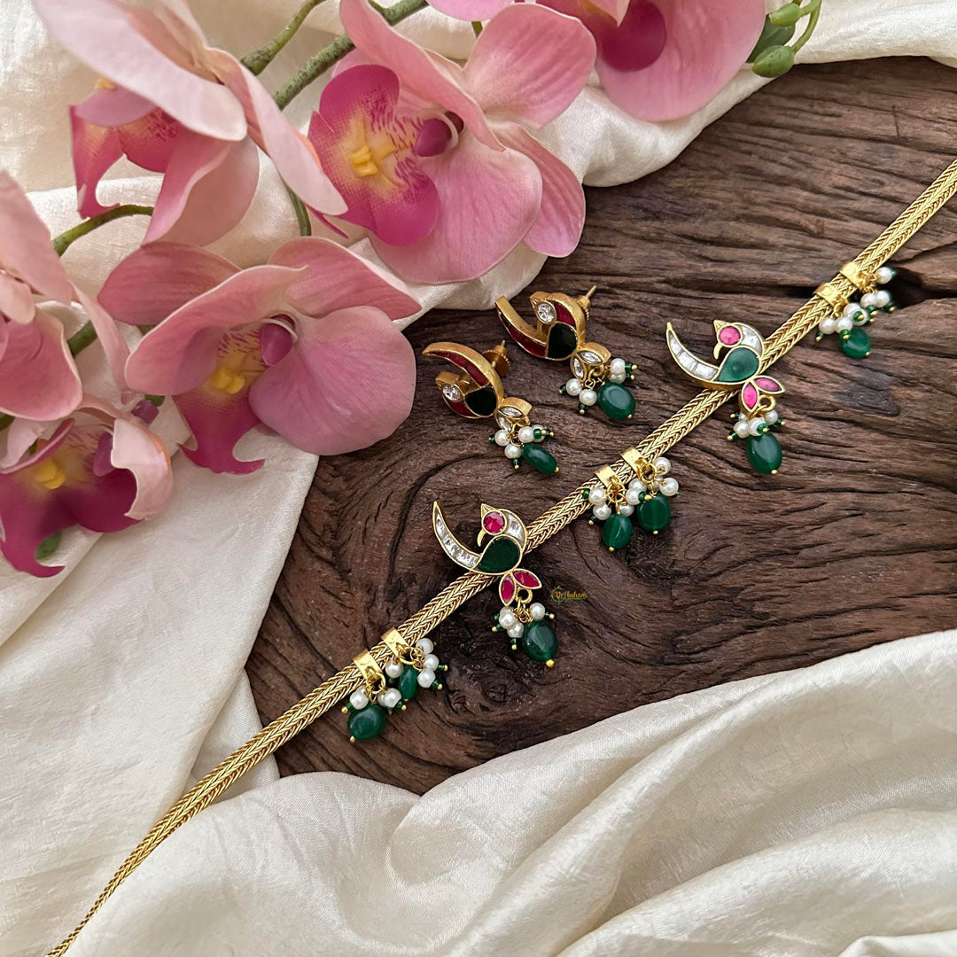 Experience elegance with our Unique Parrot Jadau Kundan Addigai! Adorned with stunning green beads and pearls, it comes with matching earrings for a complete look. Elevate your style with this one-of-a-kind piece and make a statement wherever you go!