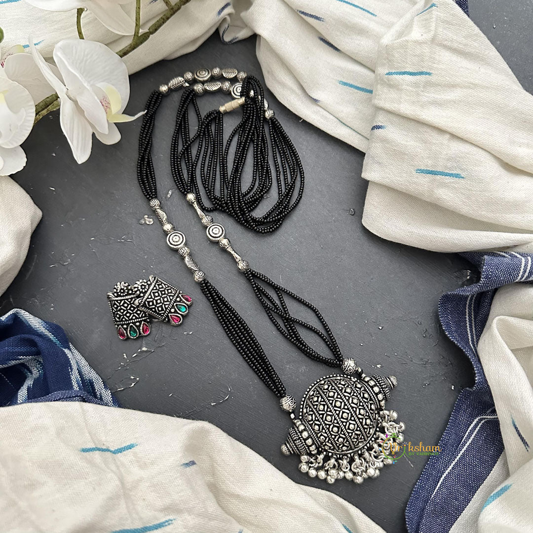 Indulge in the exclusive elegance of our Unique Pendant Black Bead Chain Neckpiece. Complete with matching earrings, this exquisite set boasts a one-of-a-kind pendant and delicate black bead chain. Elevate any outfit with this sophisticated and tasteful accessory.