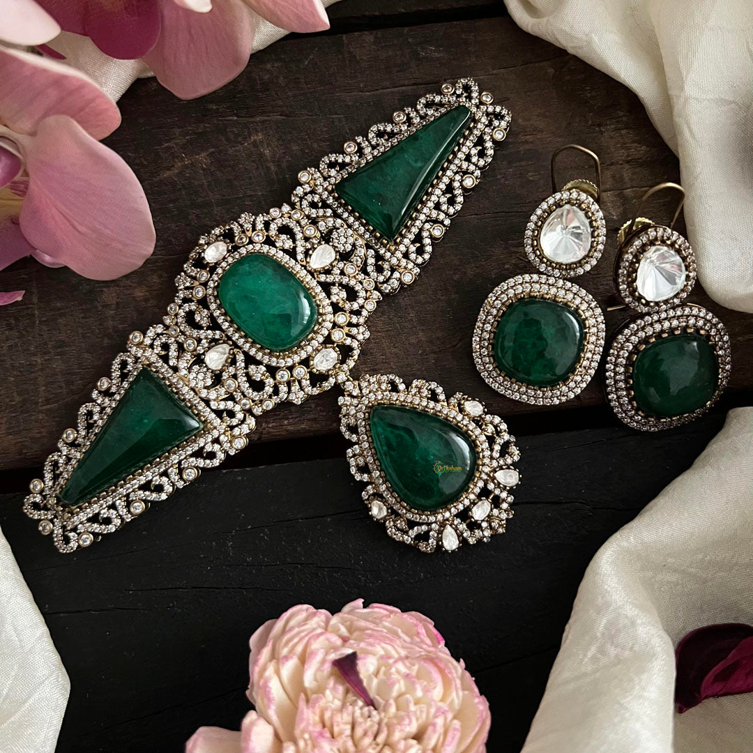 Make a statement with our Unique Victorian Diamond Choker in Green. This elegant piece is sure to turn heads with its intricate design and stunning diamonds. Perfect for special occasions or adding a touch of luxury to your everyday look. Elevate your style and feel confident with this one-of-a-kind choker. Comes with matching earrings.