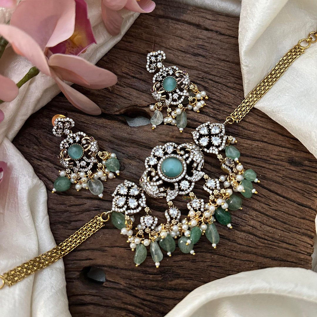 Transform any outfit into an elegant and timeless look with our Exclusive Victorian Diamond Choker. The pastel green beads add a touch of color and charm, while the intricate design and sparkling diamonds radiate sophistication. Perfect for special occasions or adding a touch of glamour to everyday wear. Comes with matching earrings.
