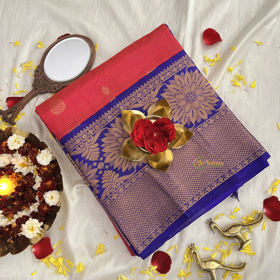 Pink with Blue Vairaoosi Silk Cotton Saree - Festive wear saree – Vairaoosi -small and medium butaa pattern throughout the saree; comes with Blouse attached. Two side contrast border and pallu. Kanchivaram pure silk border.