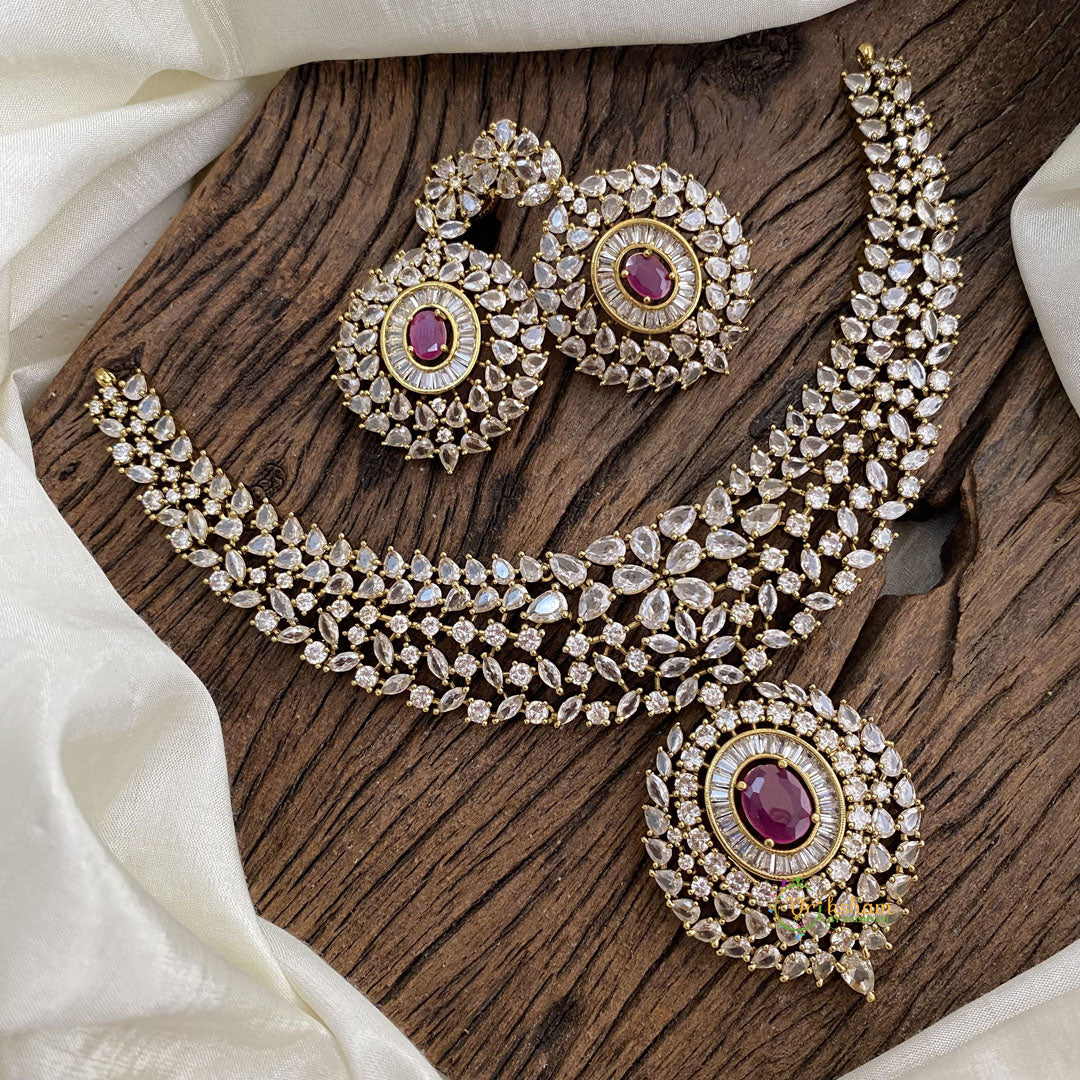 Victorian Diamond Choker Short Neckpiece - Precious Redish Pink oval victorian diamond and white diamond studded three layered royal jewelry; comes with matching earrings.