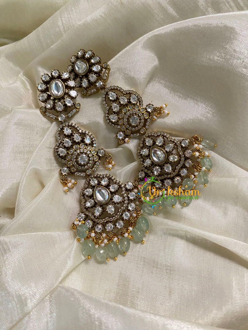 Pastel Green Bead Victorian Diamond Danglers -2 tier pattern stone set; bead finish danglers.