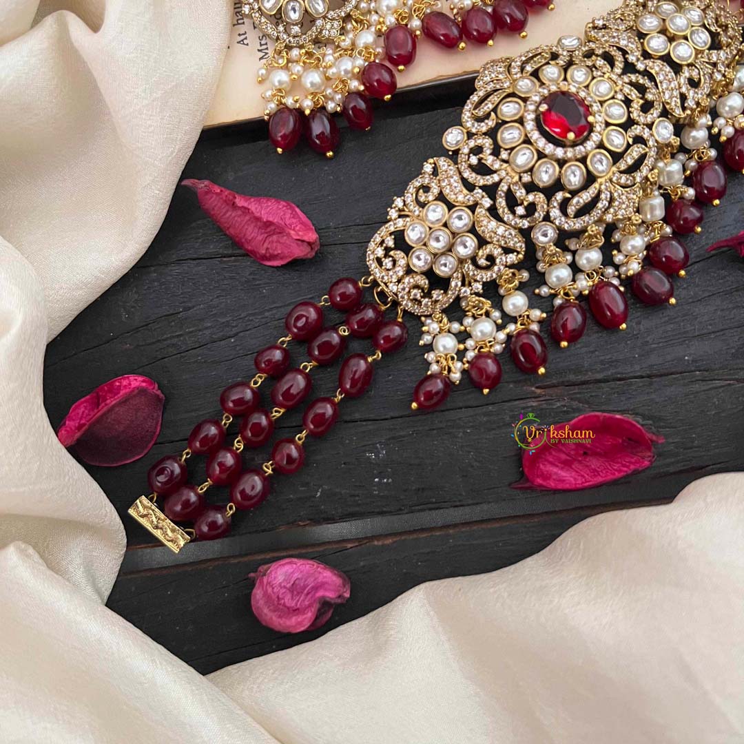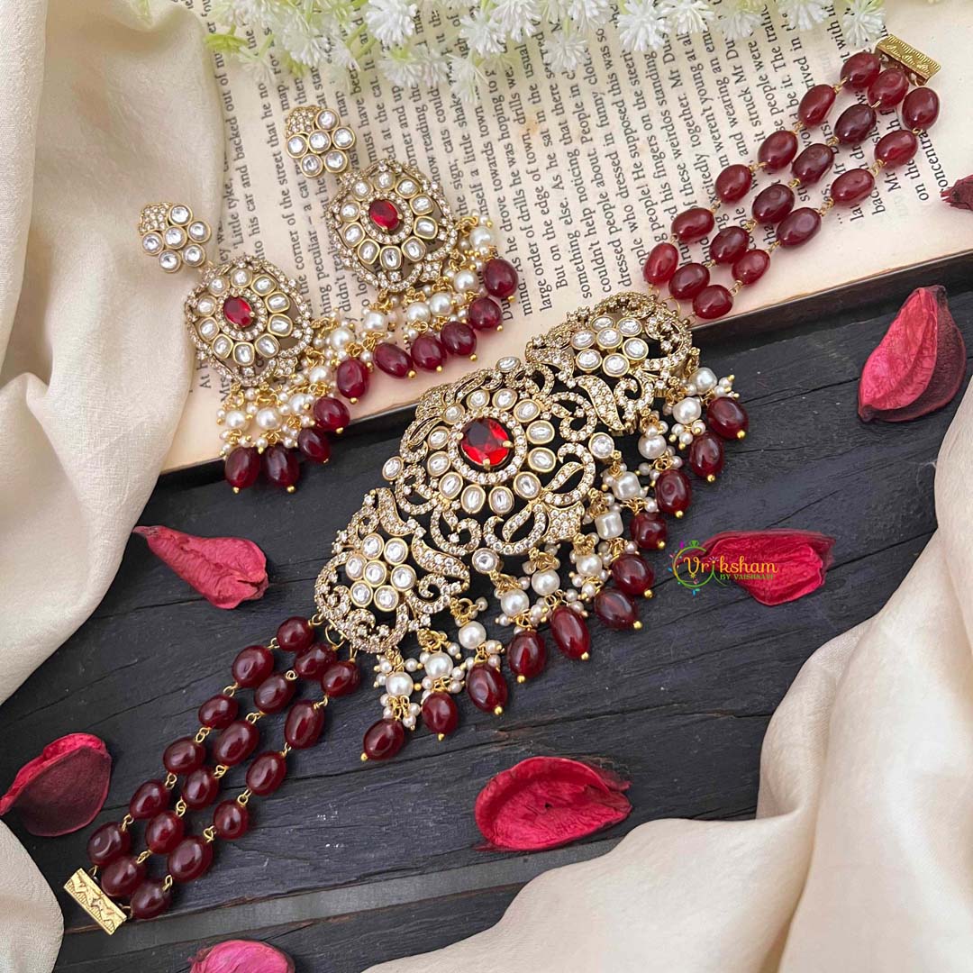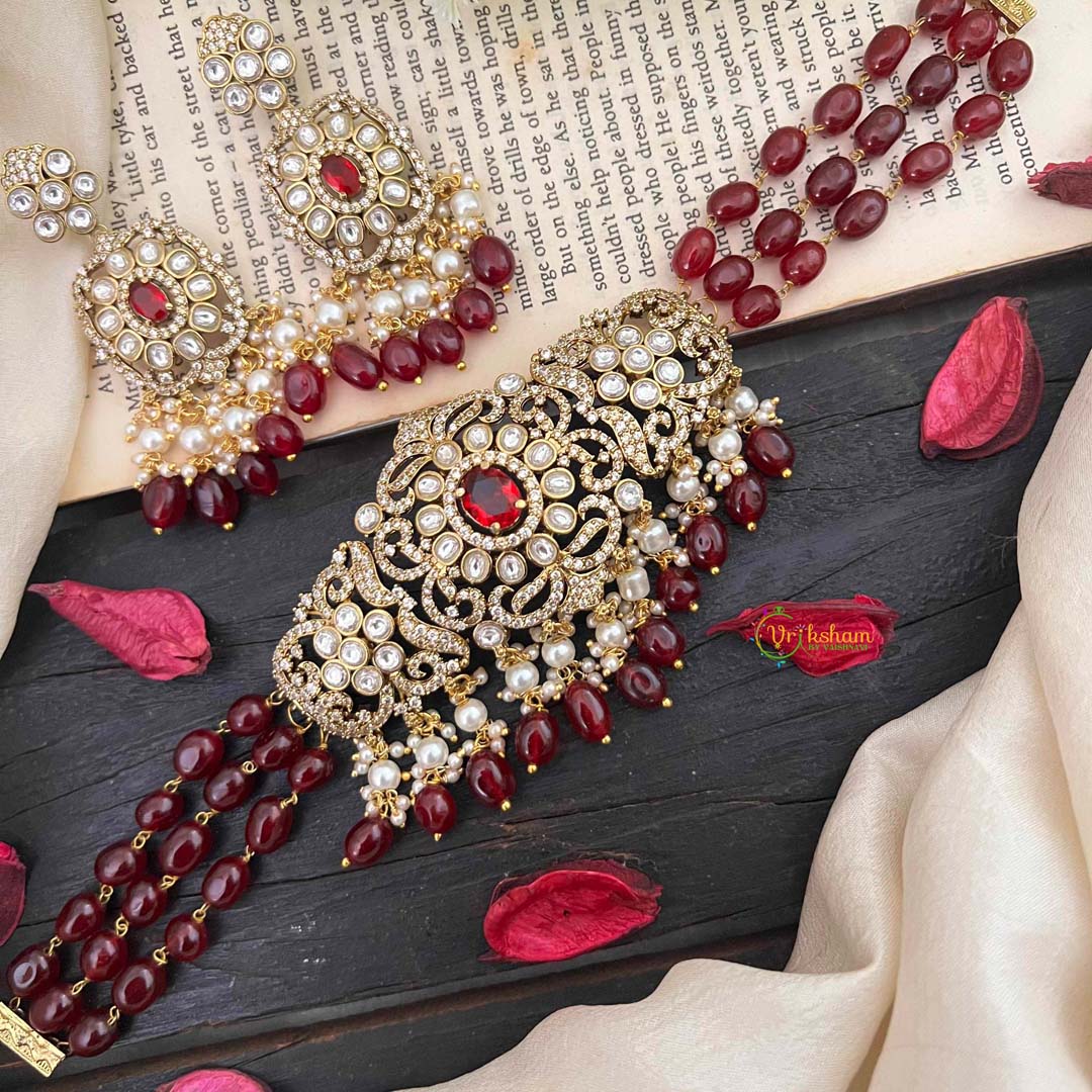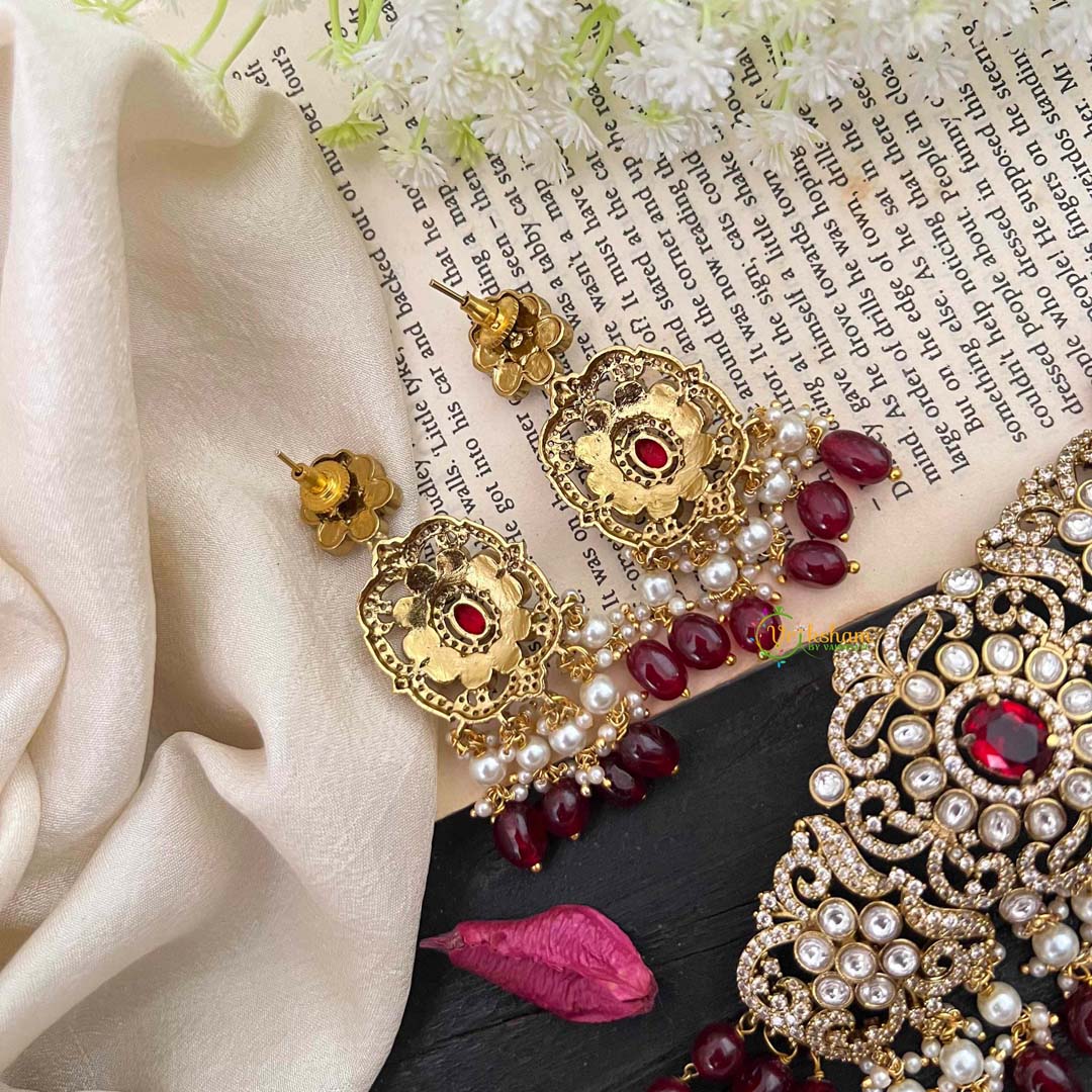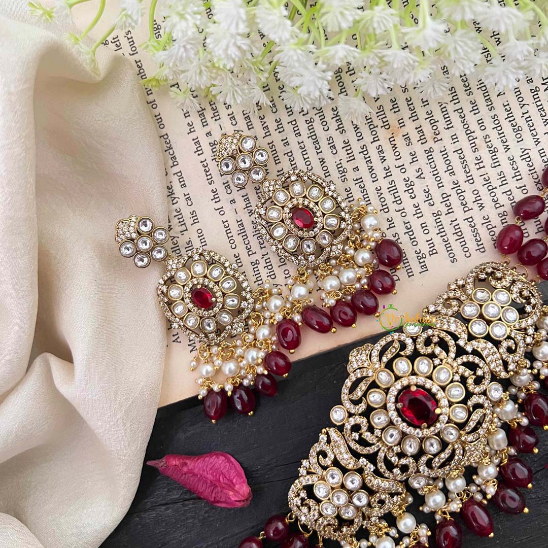 Red Victorian Diamond High Neck Choker - precious red stone studded Red Bead royal jewelry; comes with matching earrings.