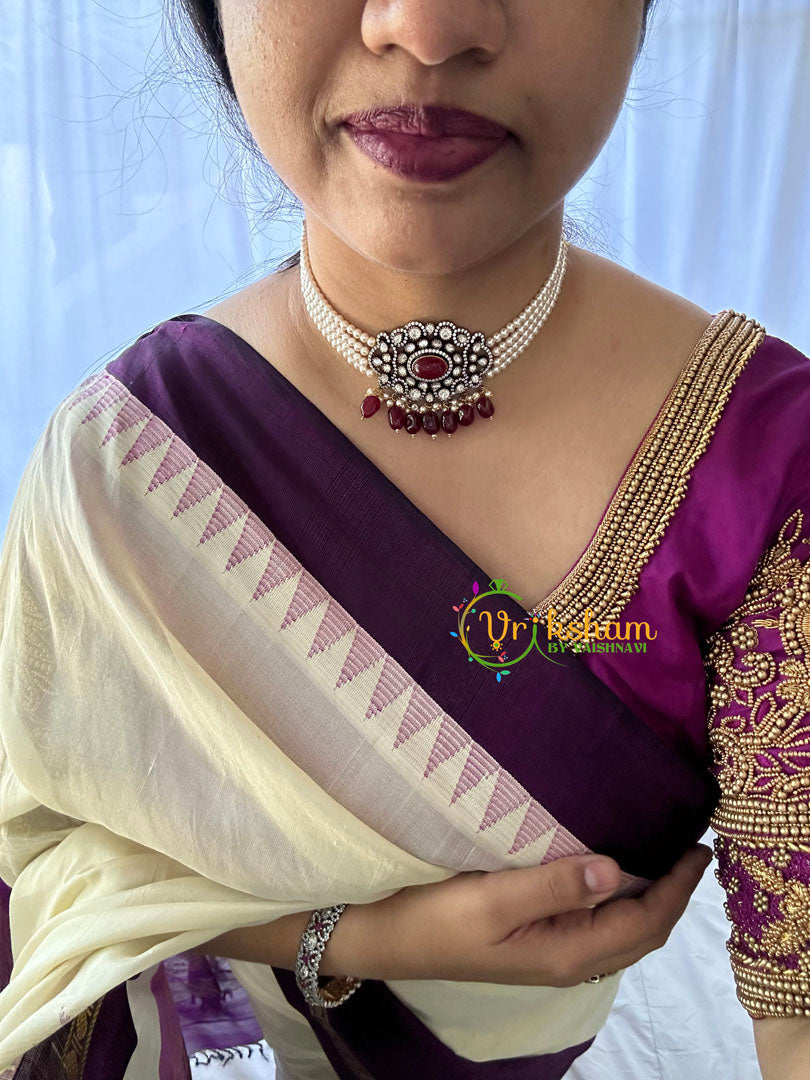 Pearl Victorian Diamond High Neck Choker - RED precious stone and white AD stone studded Red bead finish royal jewelry; comes with matching earrings.