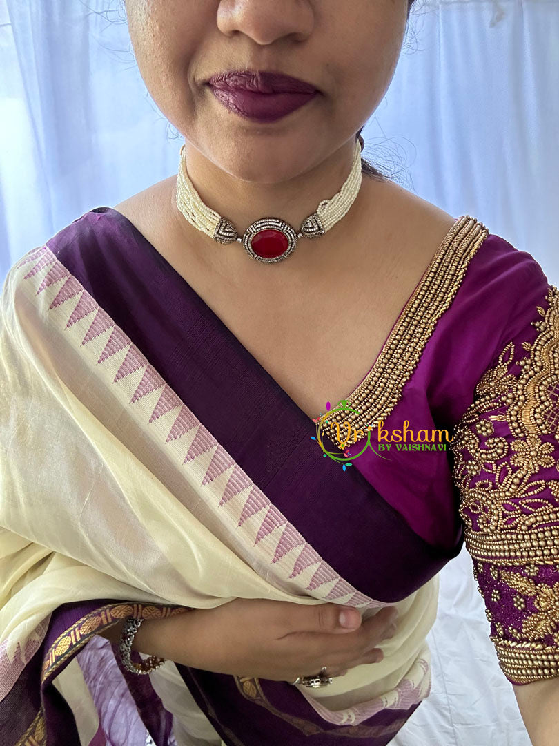 Pearl Victorian Diamond High Neck Choker - red precious stone and white AD stone studded perl finish royal jewelry; comes with matching earrings.