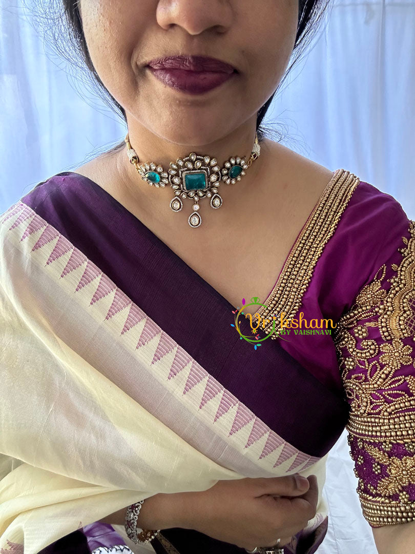 Aqua Blue Victorian Diamond High Neck Choker - Semi precious stone and white stone studded stone finish royal jewelry; comes with matching ear danglers with beads.