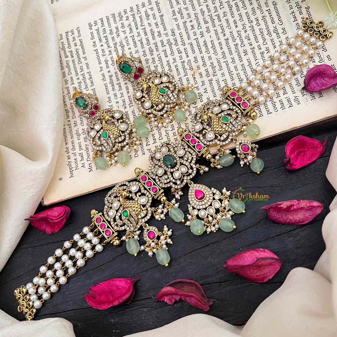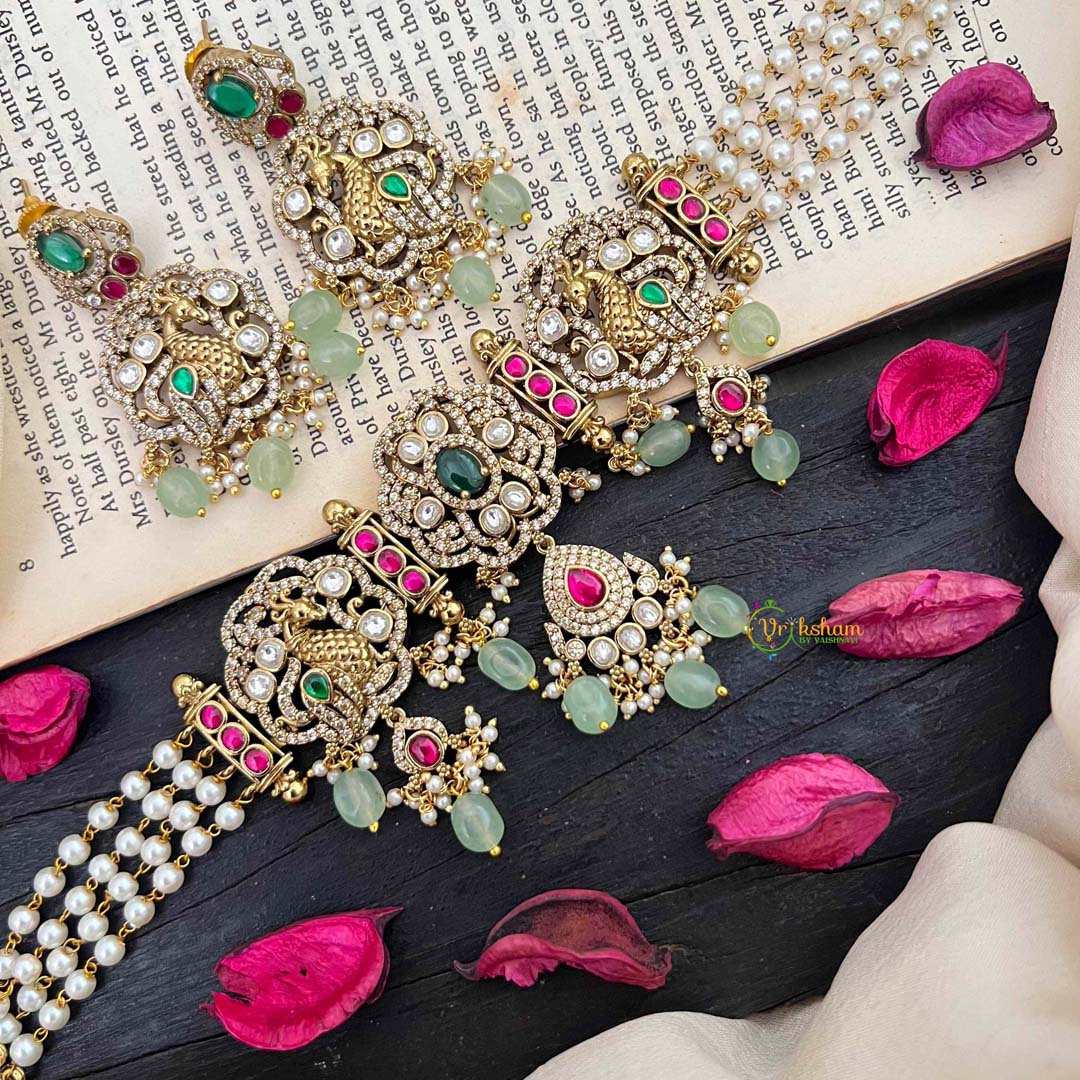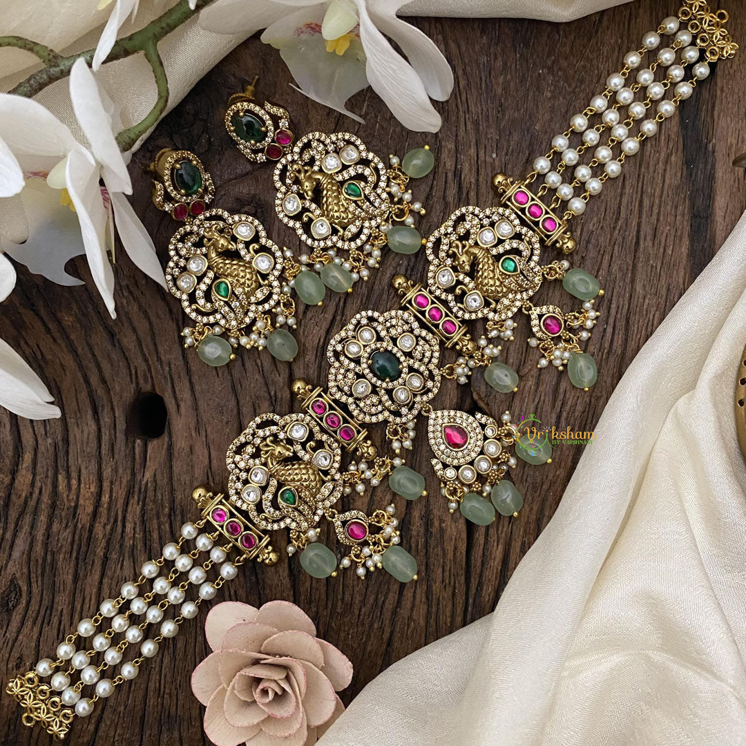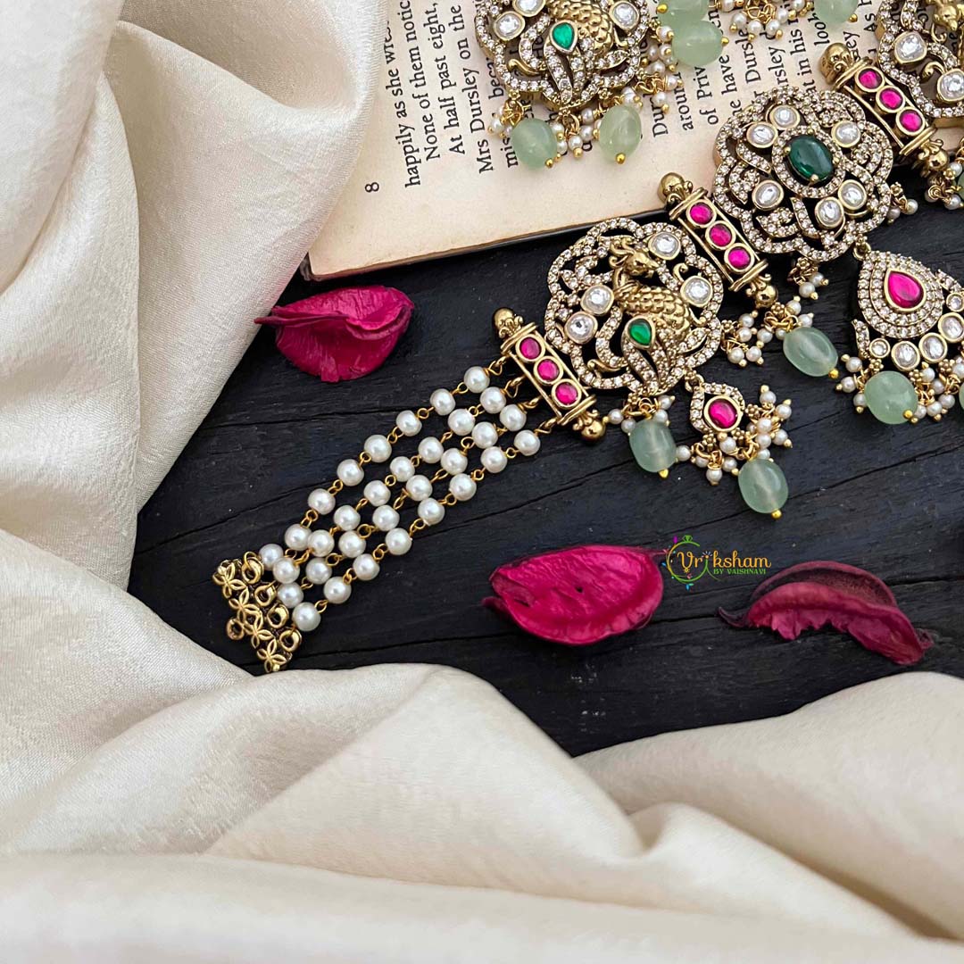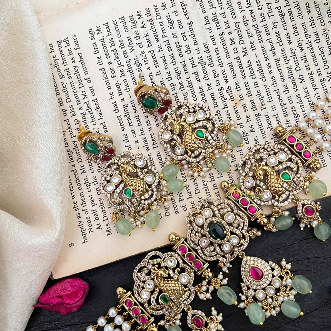 Pearl Victorian Diamond High Neck Choker - precious stone studded Pastel Greeb BEAD royal jewelry; comes with matching earrings.