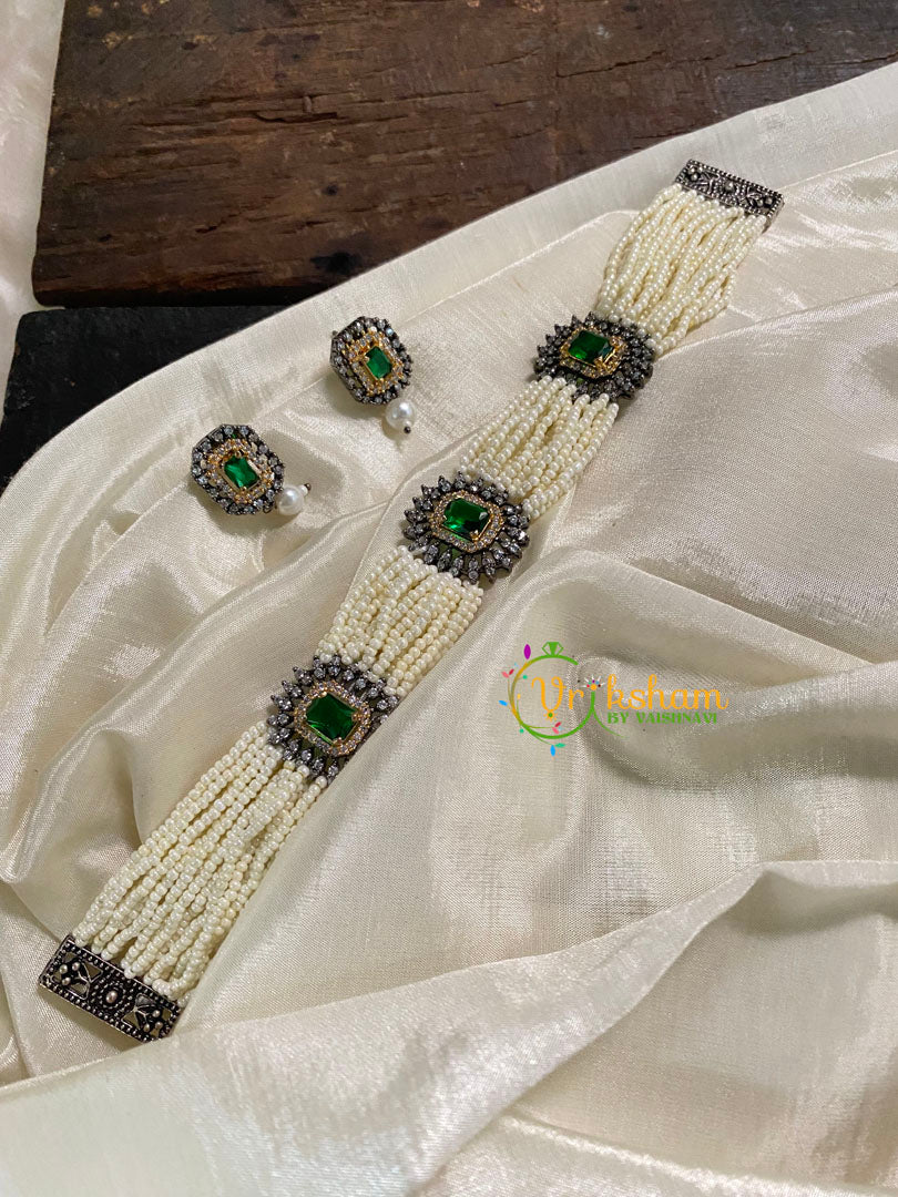 White Bead Victorian Diamond High Neck Choker - precious stone studded neckpiece ; comes with matching earrings.