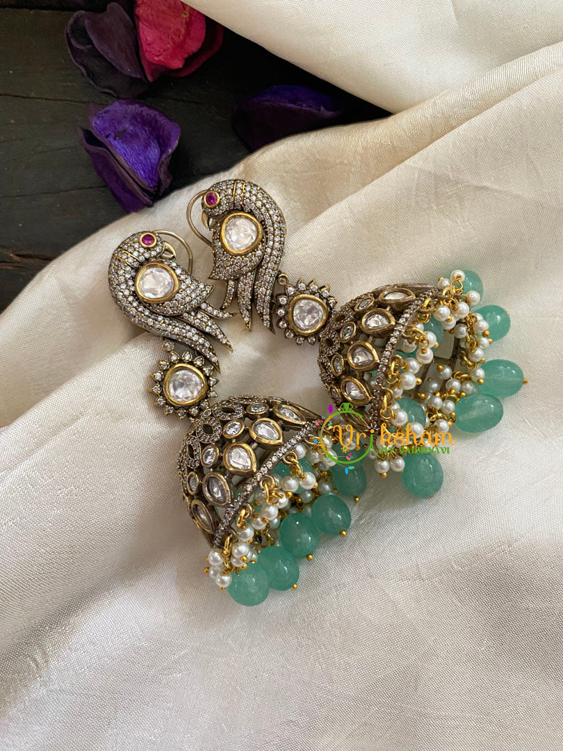 Green Bead Victorian Diamond Jhumkas -Parrot stud Bridal Jhumkas – stone set stud part; pearl and bead finish jhumkas.