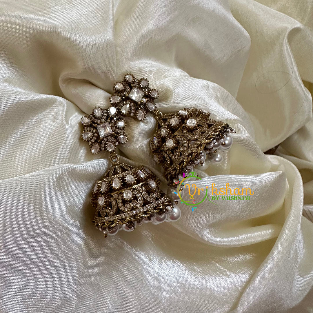 Victorian Diamond Jhumkas - festive danglers - Victorian Diamond Earrings -semi precious stone set; bead or Pearl finish jhumkas.