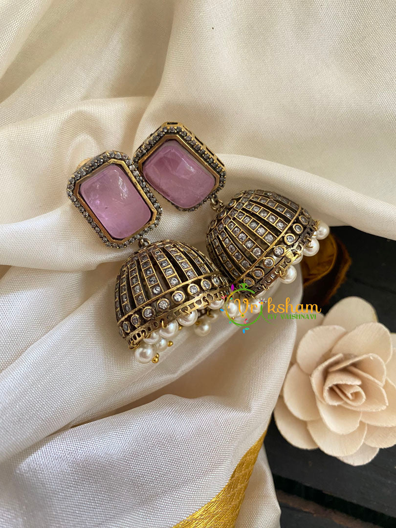 Premium Victorian Diamond Jhumkas -Bridal Jhumkas – Green and pink stone set pearl finish jhumkas.