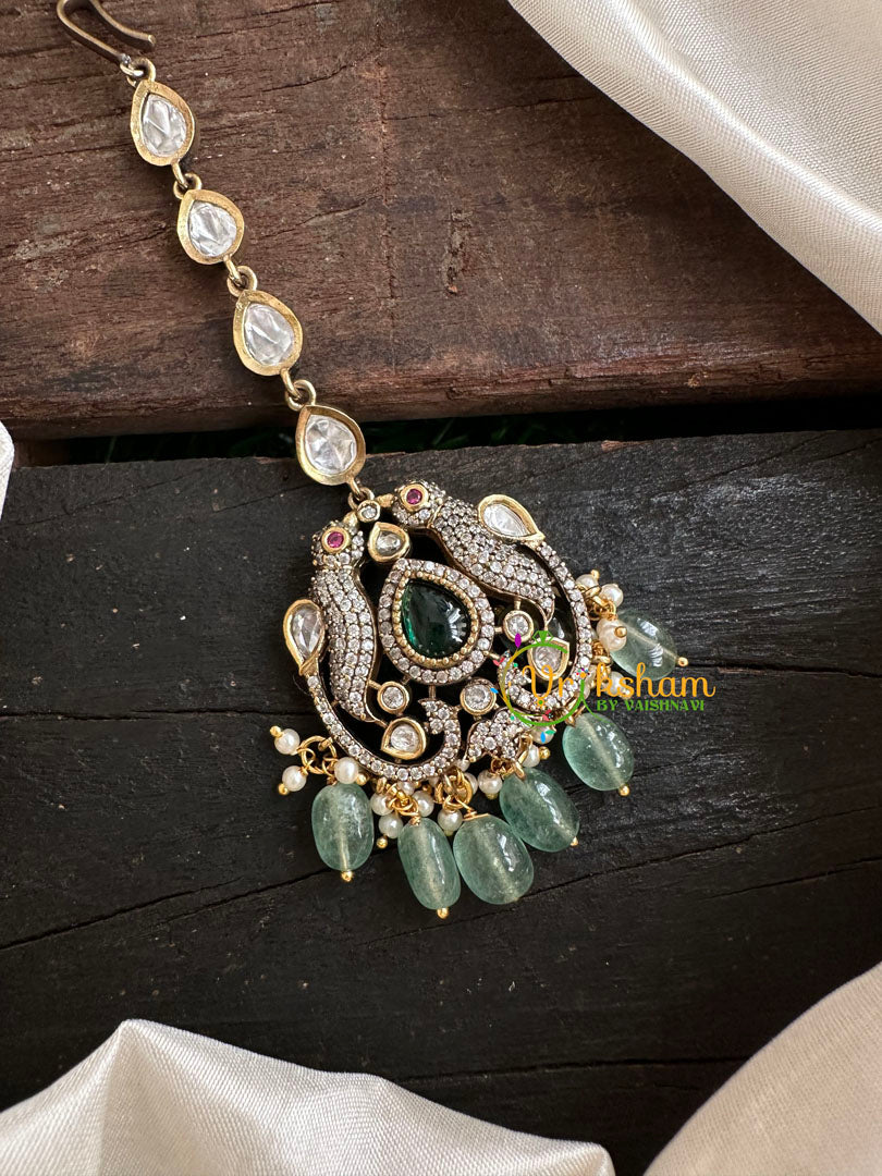 Green Victorian Diamond Maang Tikka - Dual Parrot designed; semi precious dark green stone studded pastel green bead finish maang tikka.