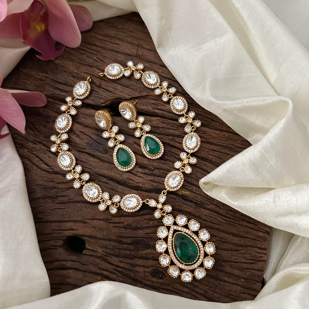 Add a touch of elegance to your outfit with our Victorian Diamond Pendant Short Necklace. The dainty tear drop design and green hue add a classic charm, while the diamond accents add a touch of sparkle. Perfect for any occasion, this necklace is sure to make you stand out in style. Comes with matching earrings.