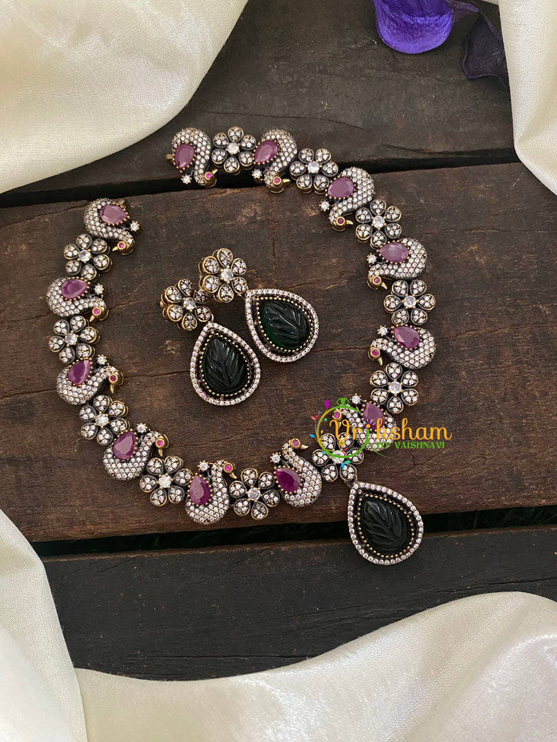 Victorian Diamond Pendant Short Neckpiece -Emerald Green , pink and white precious stone studded royal jewelry; comes with matching earrings.