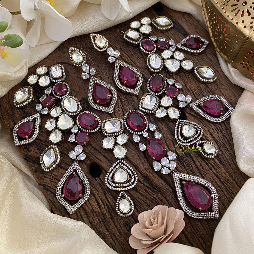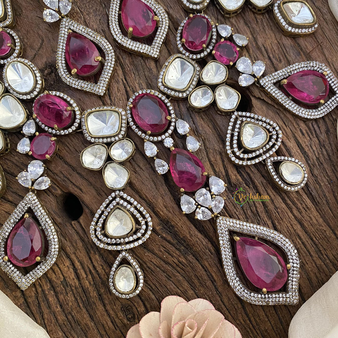 Wine red Victorian Diamond Short Neckpiece - wine red and white precious stone studded royal jewelry; comes with matching earrings.