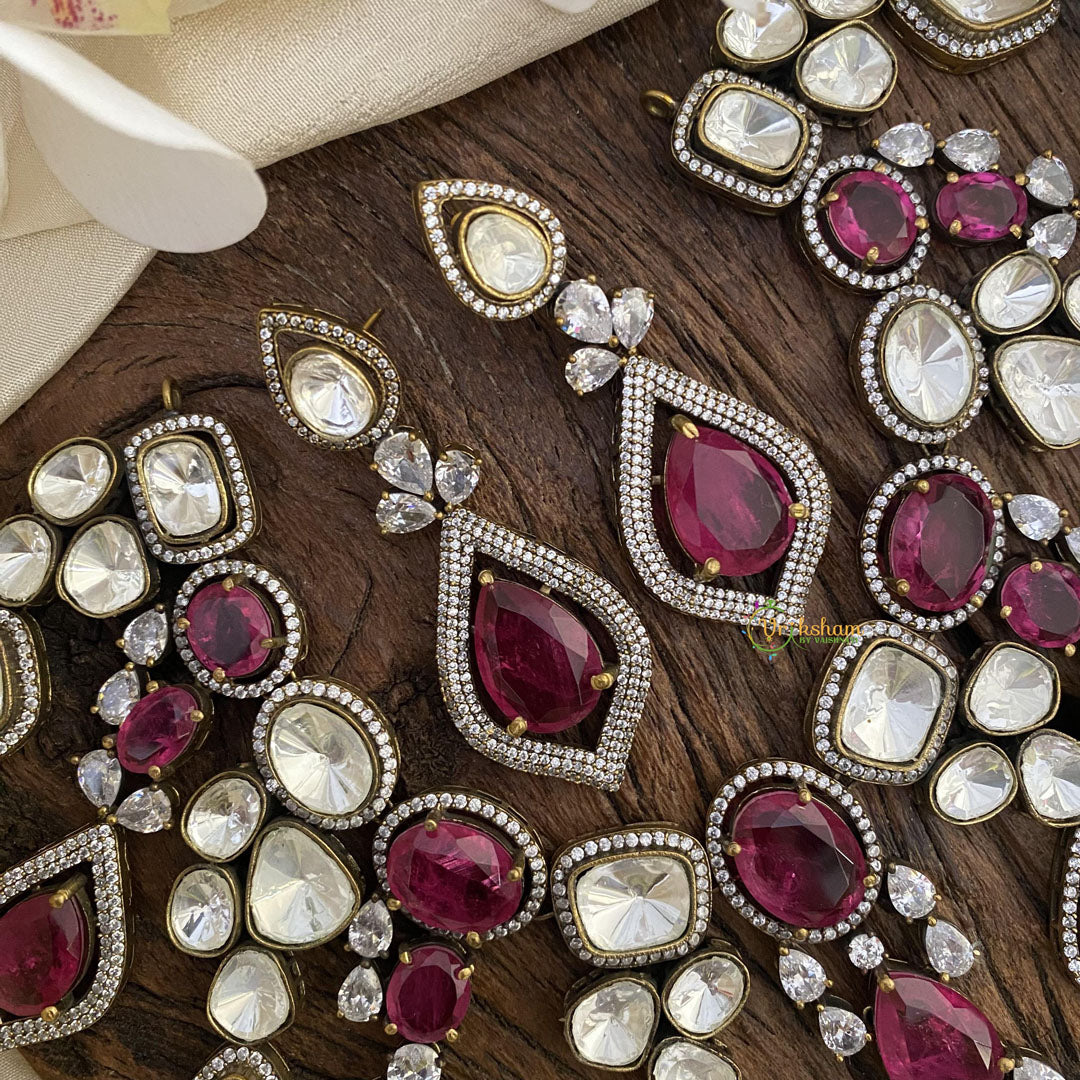 Wine Red Victorian Diamond Short Neckpiece - red and white precious stone studded royal jewelry; comes with matching earrings.