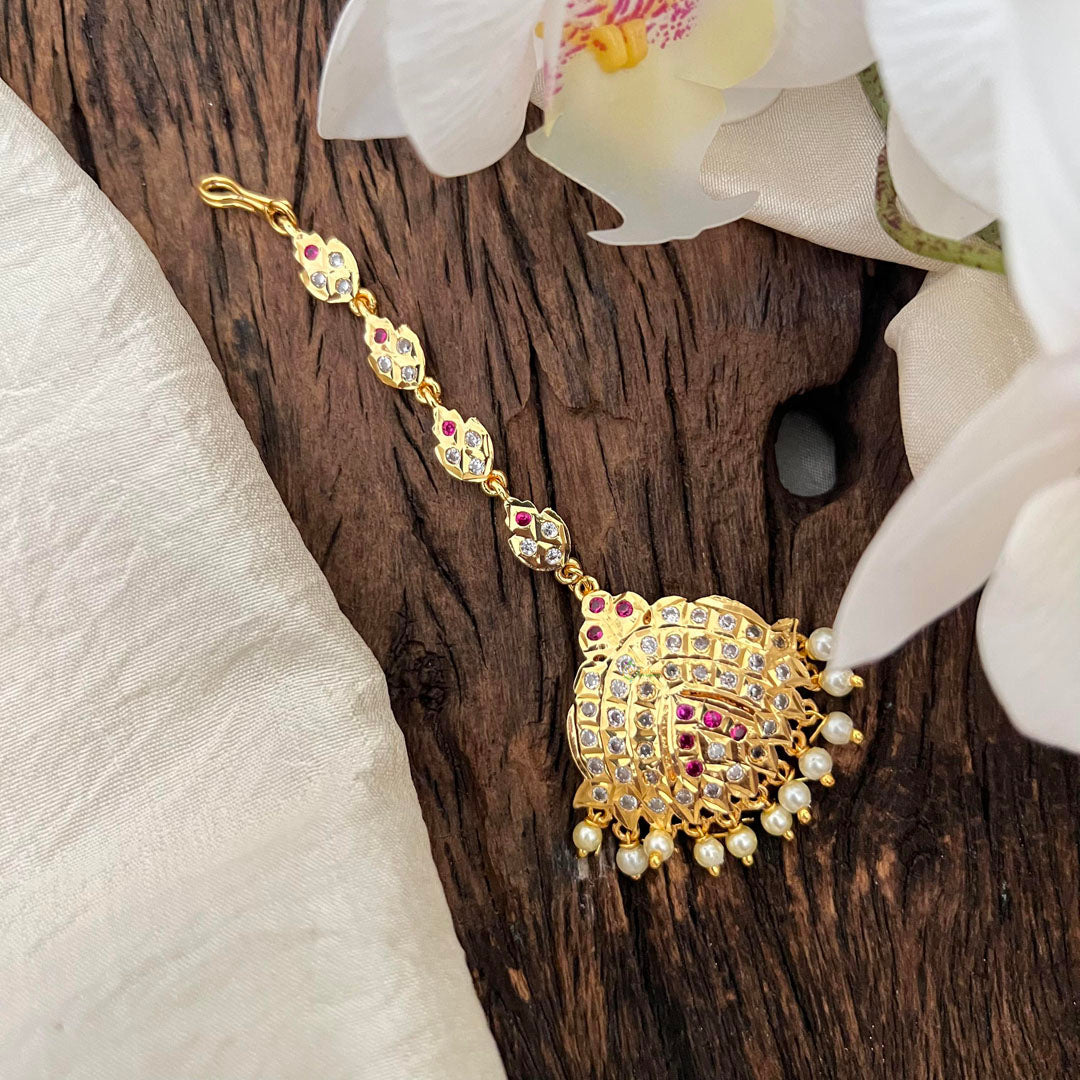 Adorn yourself in elegance with our Vintage AD Stone Maang Tikka in a bold red and white color combination. The intricate design and stunning pearls will add a touch of luxury to any look. Perfect for special occasions, this tikka is a must-have for those who appreciate timeless beauty.