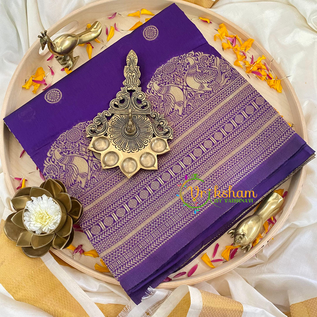 Violet Litchi Silk Saree- Festive wear saree –Medium sized butta Pattern throughout the saree; comes with Blouse attached. Wavy big border saree.