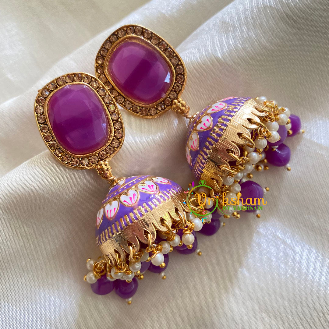 Violet Meenakari Jhumkas-Hand painted-Oblong Stud with hand painted Jhumkas base. Bead and Pearl finish. Medium size.