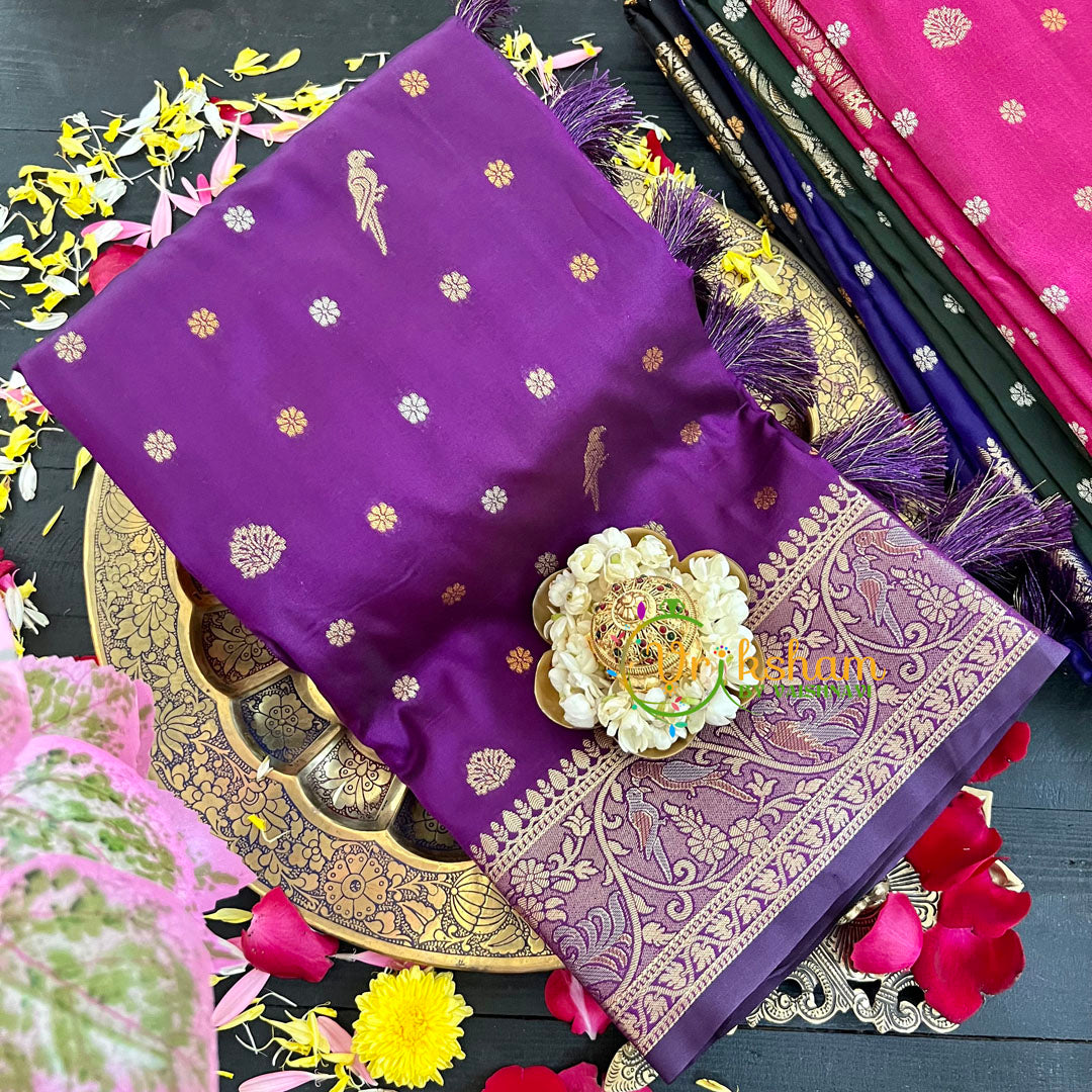 Violet Semi Soft Silk Saree- Festive wear saree –Dual color Butta, peacock and parrot Pattern throughout the saree; comes with Blouse attached. Two side border and pallu.