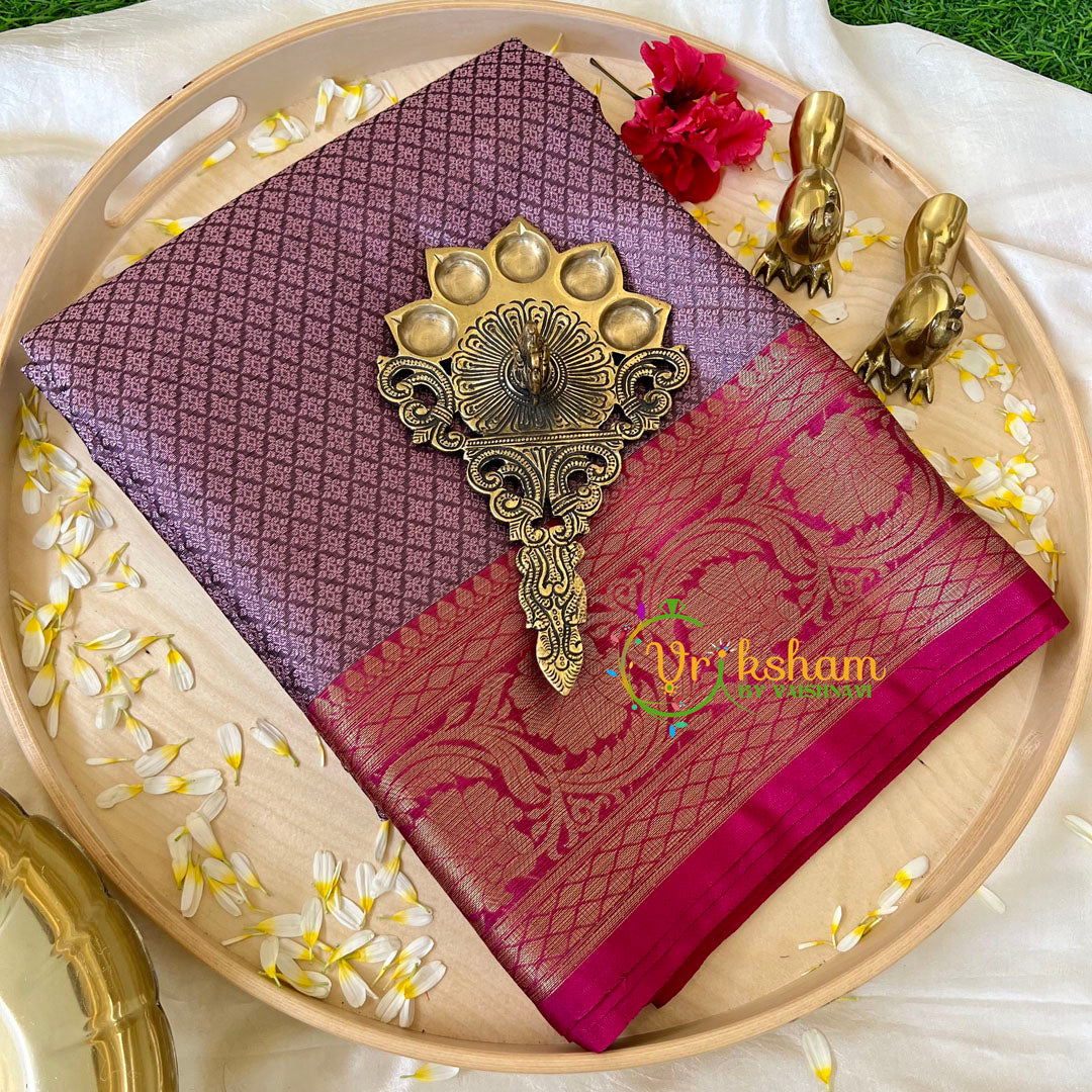 Violet with Pink Kora Muslin Saree - Festive wear saree –self work throughout the saree; comes with Blouse attached. Two side border of same size.