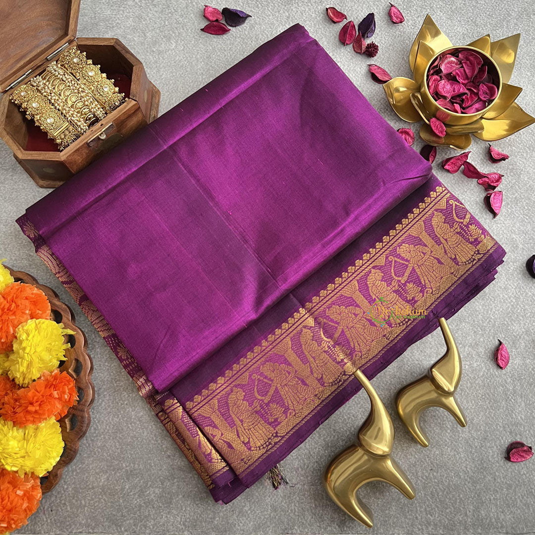 Indulge in luxury with our handloom Violet Silk Cotton Saree, featuring a golden zari Sita Swayamvar border. The perfect combination of traditional craftsmanship and contemporary elegance, this saree is sure to make you stand out with its sophisticated allure. Elevate your style with this exclusive piece.