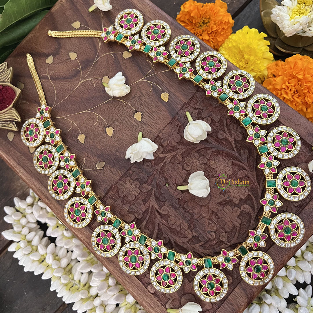 The Vriksham 18 Chakri Style Kundan Jadau Short Neckpiece showcases exquisite craftsmanship with its harmonious blend of green, red, and white stones. This elegant piece captures traditional charm through its intricate design, making it an ideal accessory to enhance your formal attire with a touch of timeless sophistication.