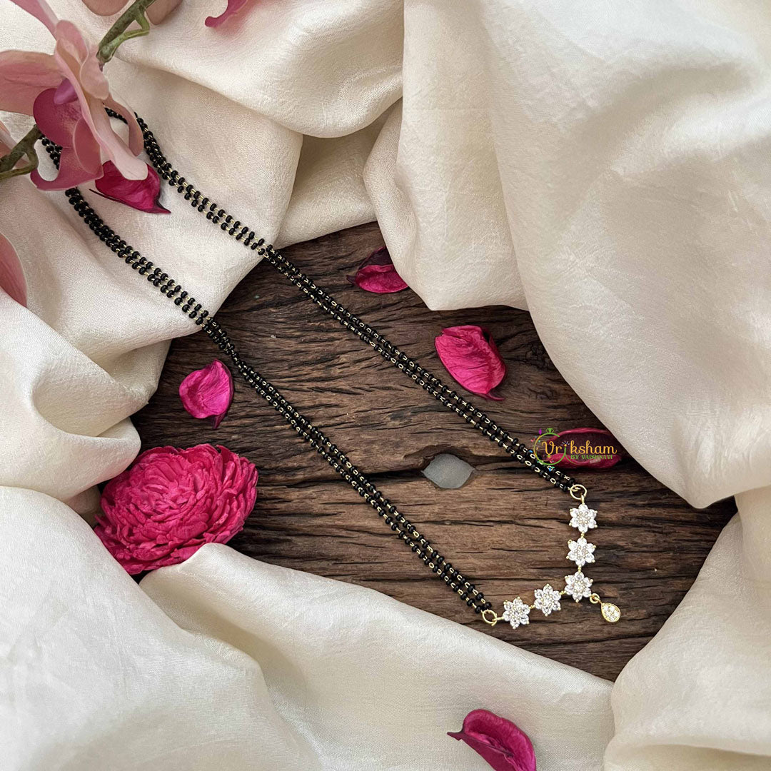 The Vriksham 3 Floral Shimmer AD Stone Mangalsutra captures delicate elegance with its trio of floral motifs embellished with sparkling AD stones. This sophisticated design seamlessly blends feminine charm with timeless tradition, making it an exquisite accessory to celebrate your special bond with grace and style.