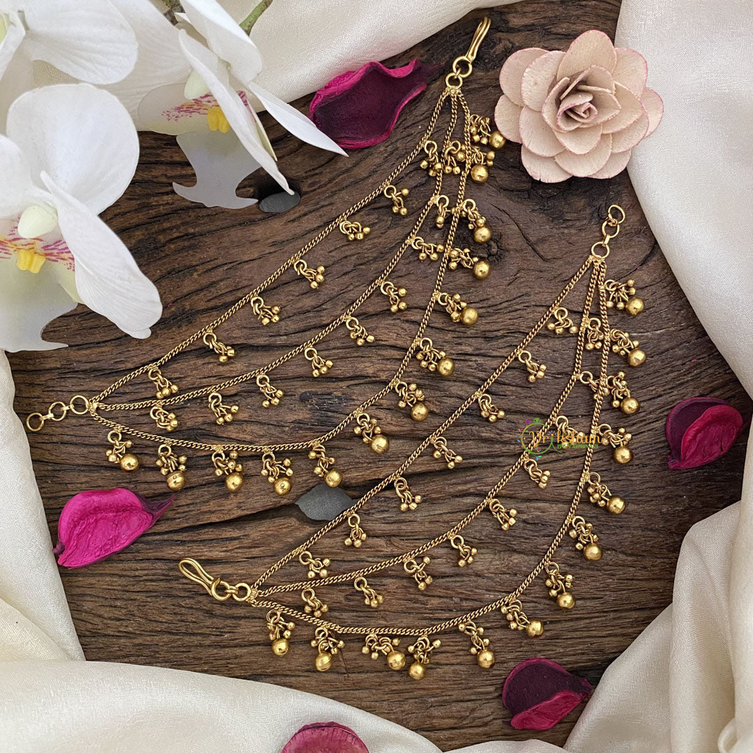 Introducing Vriksham's exquisite 3 layer Ghungroo Maatil-Earchain-Gold Bead, a must-have accessory for any elevated ensemble. The layers of delicate golden beads create a soothing chime with movement, adding a touch of elegance to any outfit. Elevate your style with this exclusive piece from Vriksham.