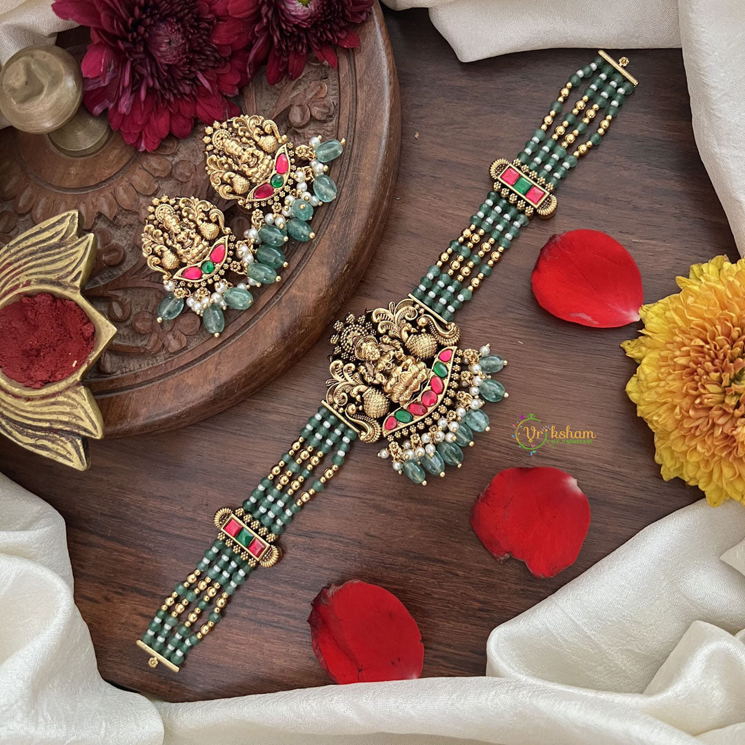 The Vriksham 4 Layer Aqua Green Pearl Mala High Neck Choker showcases four elegant strands of aqua green beads and pearls, layered to perfection for a sophisticated look. Centered with a vibrant red Lakshmi pendant, this choker beautifully merges traditional charm with modern elegance. Perfect for enhancing your special occasion attire, it offers a graceful and auspicious statement.