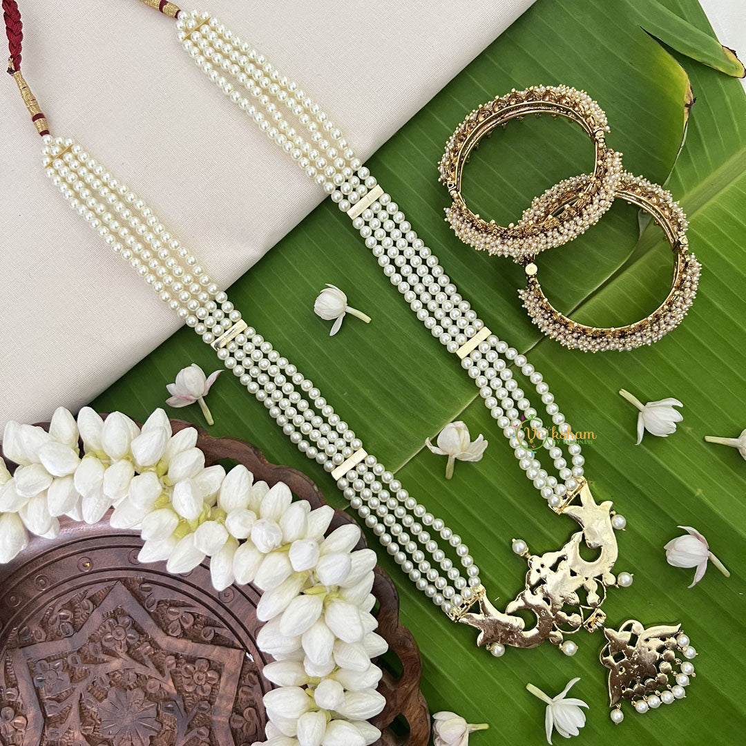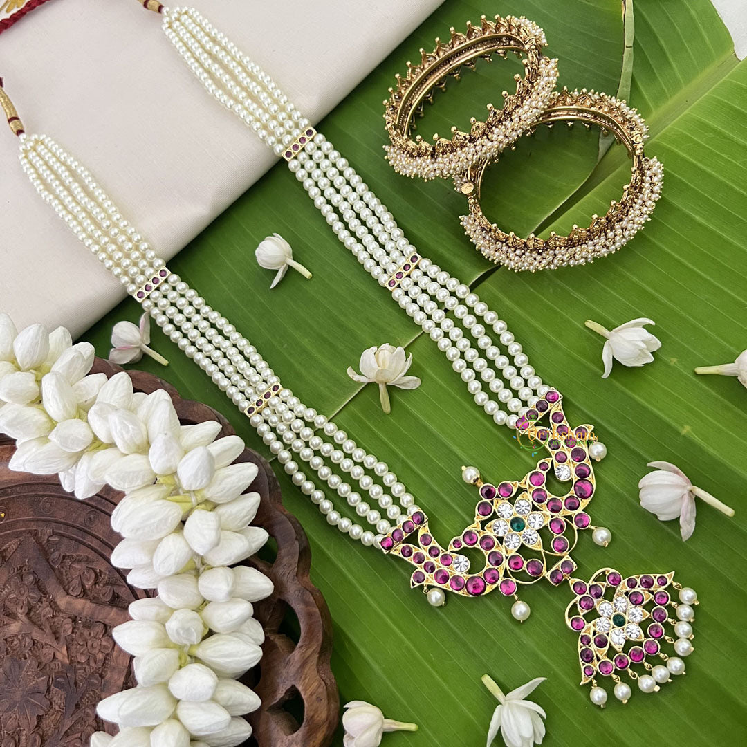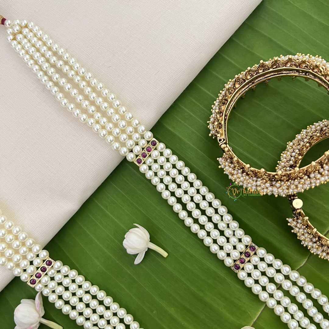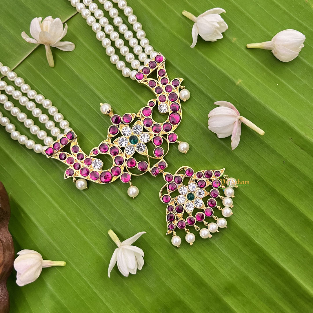 The Vriksham 4 Layered Kemp Stone Rani Haram with pearls is a majestic necklace that exudes regal charm. Featuring four layers of intricately crafted Kemp stones and delicate pearls, this piece offers a sophisticated statement perfect for special occasions, elevating your ensemble with timeless elegance.