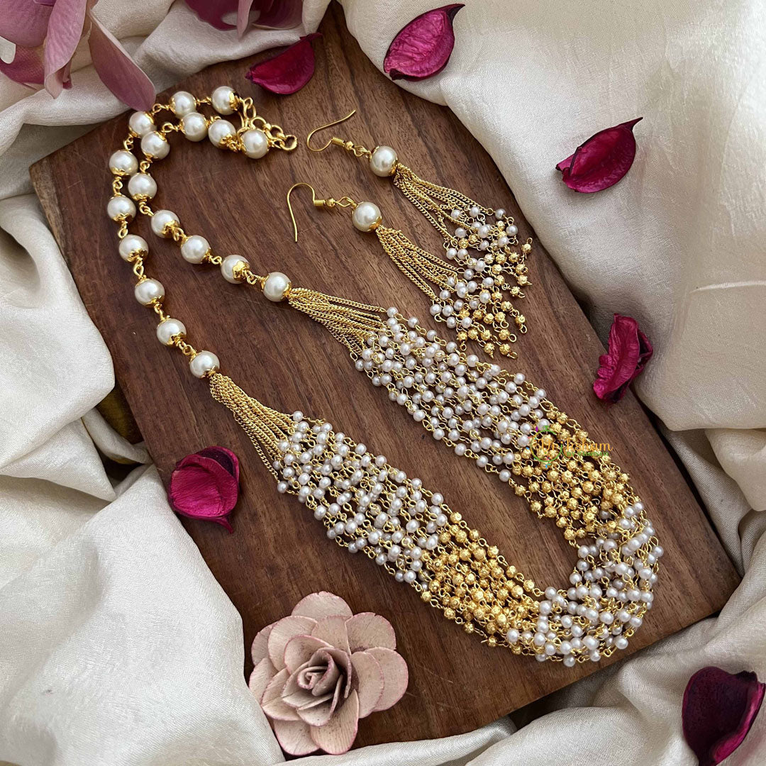The Vriksham Aarvi 14 Layer Pearl & Gold Multi-Strand Beaded Mala, accompanied by matching earrings, showcases fourteen elegant strands of pearls and gold beads. This sophisticated set combines intricate craftsmanship with timeless design, making it a perfect choice for elevating formal and traditional ensembles with refined luxury.